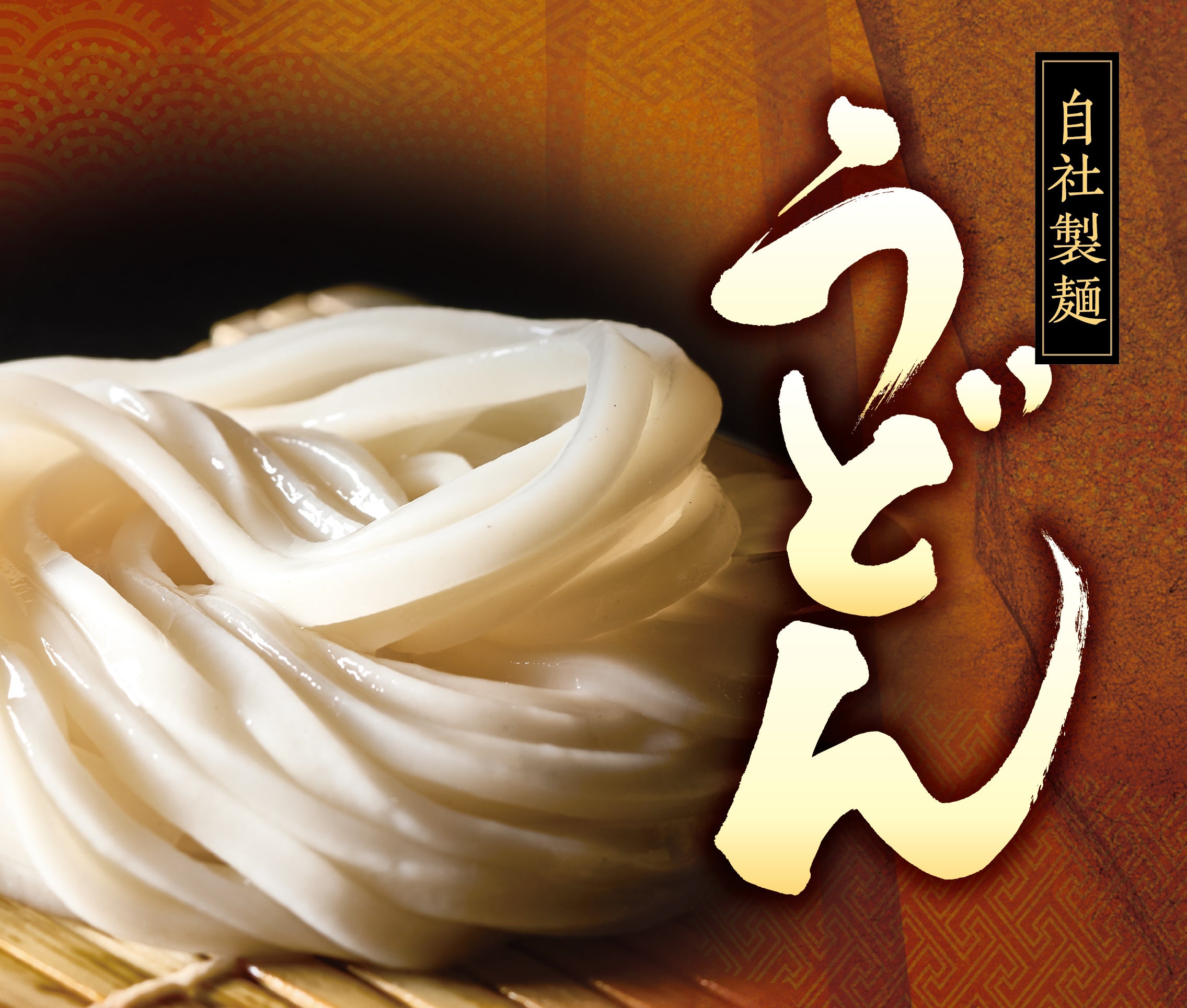 ■自社製麺『うどん』 小麦粉の香りと味わいを、さらに引き立てるこだわり製法。麺の長さと量を増やし、出汁との相性もさらに良くなりました。