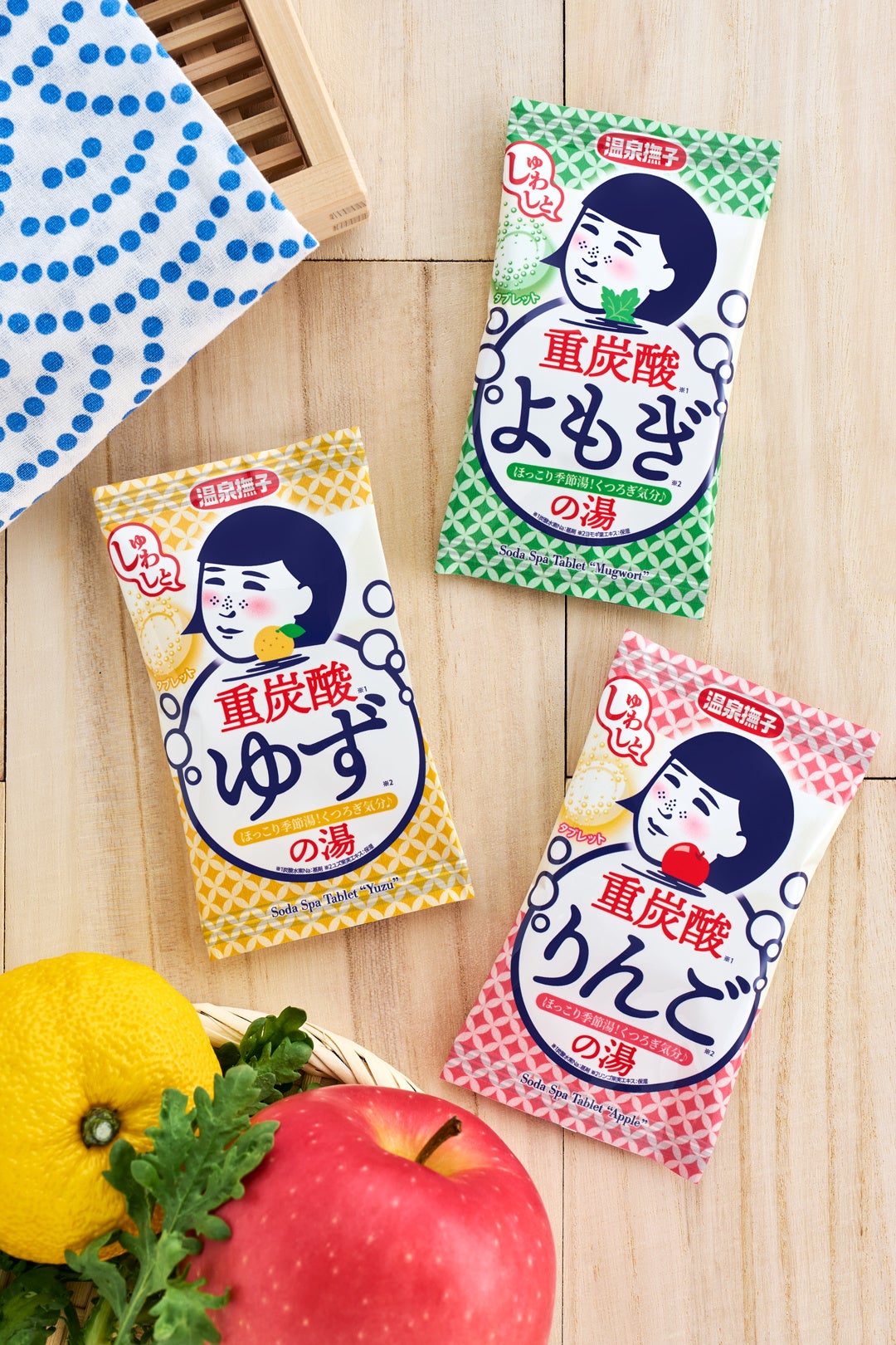 *1 炭酸水素Na:基剤(炭酸水素Naは温泉にも含まれる成分です。)*2 ユズ果実エキス:保湿 *3 ヨモギ葉エキス:保湿