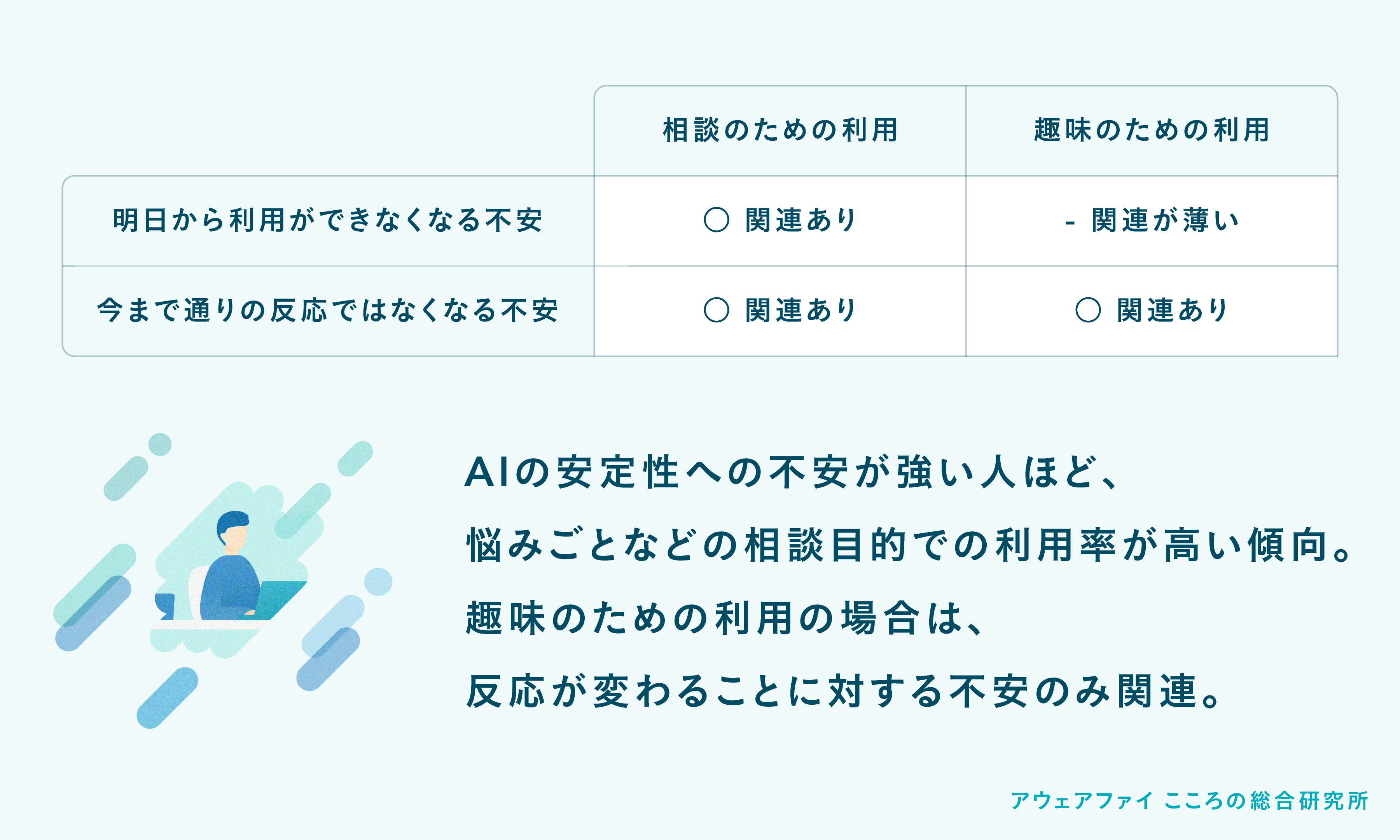 - 特に、AIの安定性への不安が強い人ほど、悩みごとなどの相談目的での利用率が高い傾向が見られました。