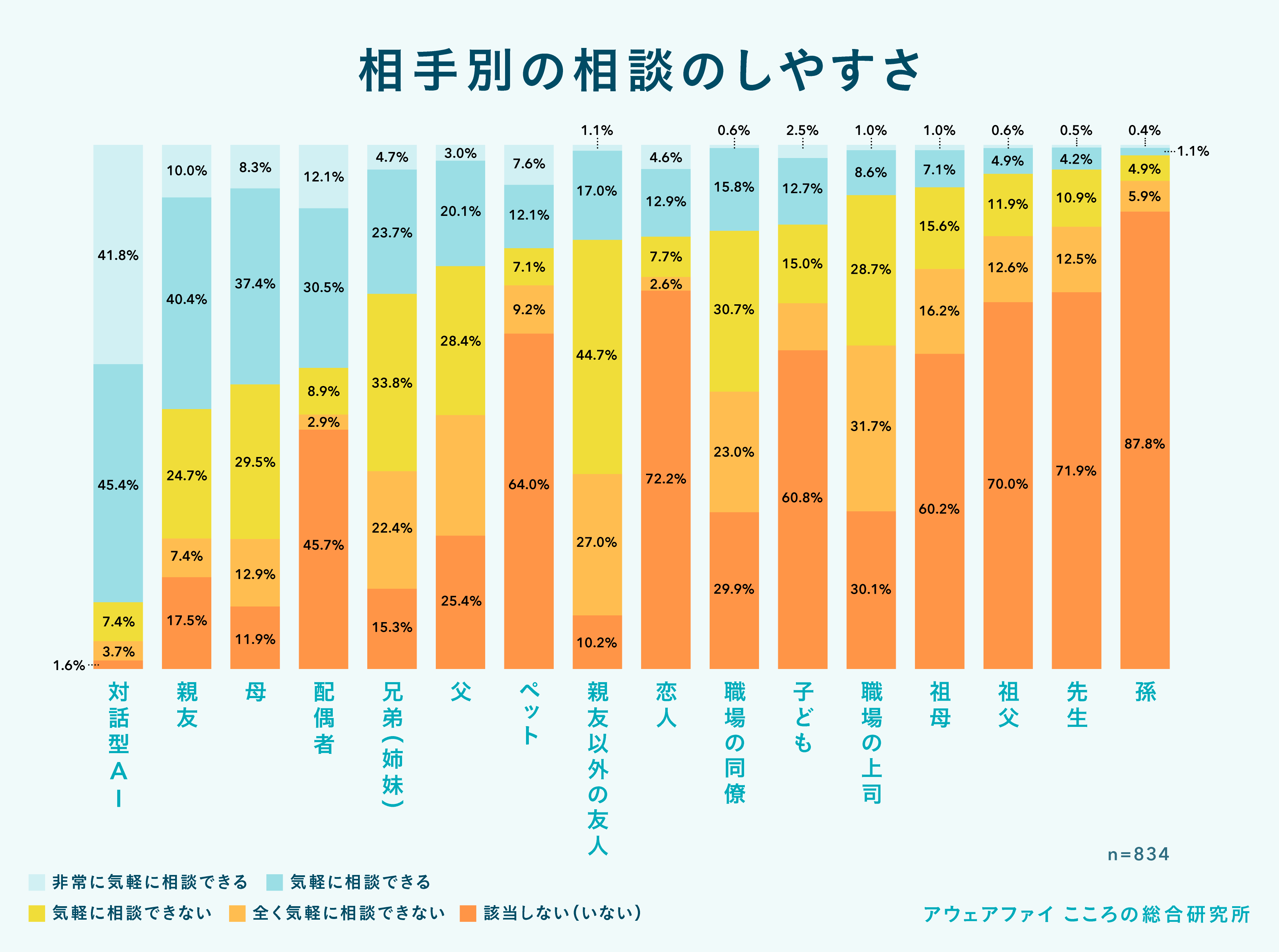 具体的には、「配偶者に相談しにくい」と回答した人が21.6%だったのに対し、AIではその割合が11.3%にとどまっています。つまり、人の中で最も相談しやすいとされる親友や配偶者と比べても、AIの方がより気軽に相談できる存在として受け入れられていることが明らかになりました。