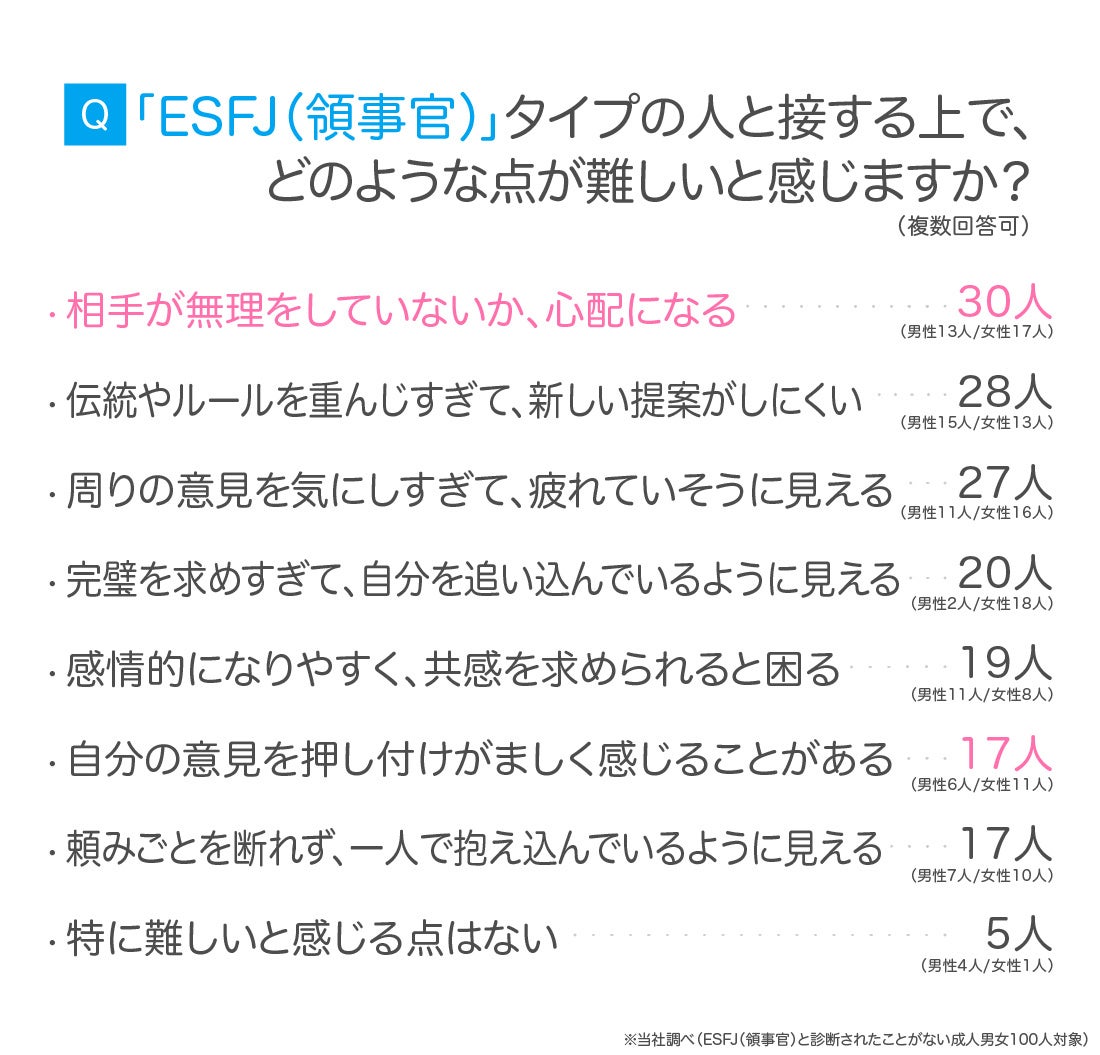一方で、ESFJ(領事官)と接する上で難しいと感じるところもあるようです。
