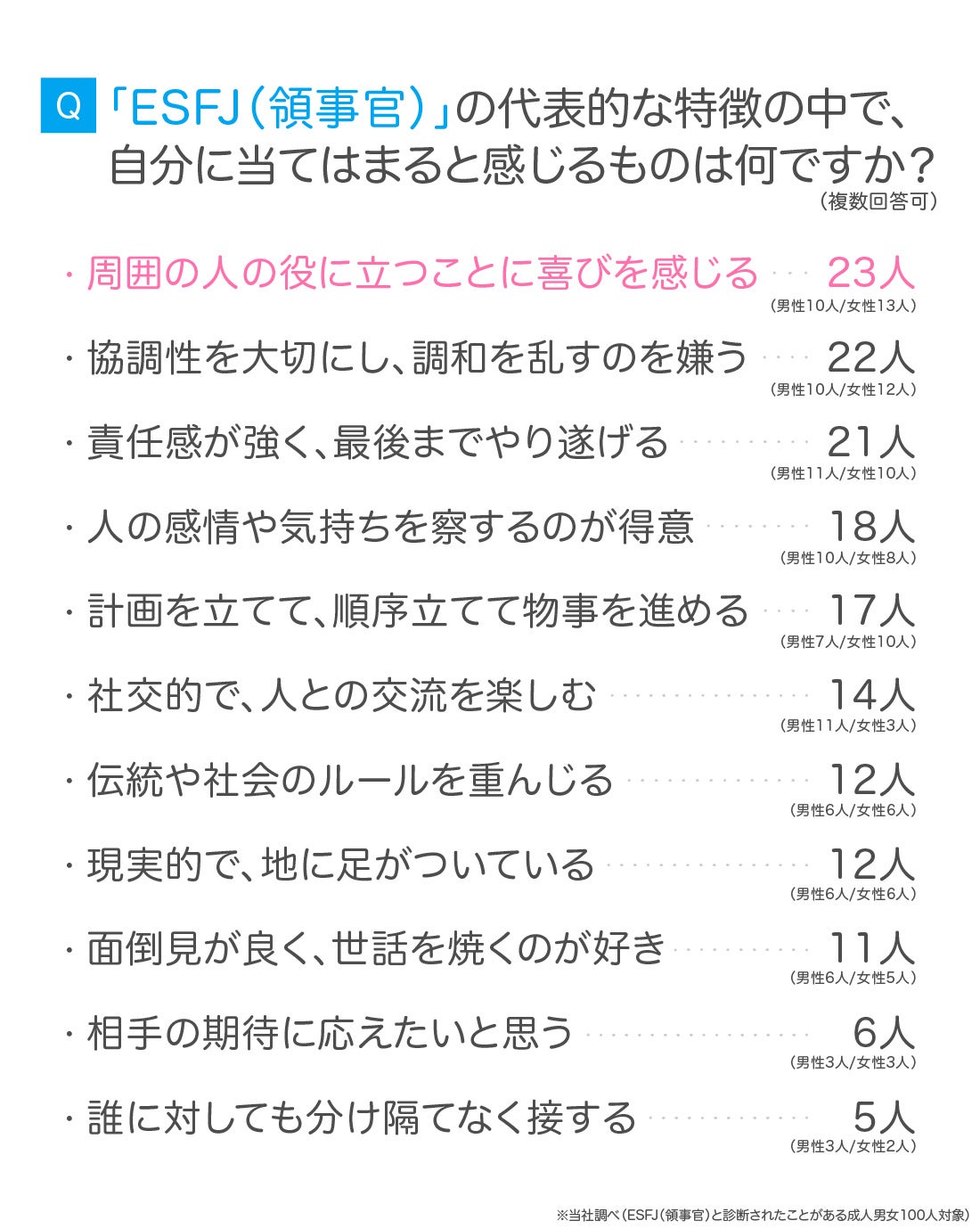 より詳しくESFJ(領事官)について調査するために、先ほどのアンケートとは別に、「ESFJ(領事官)と診断された経験のある成人男女100人」を対象にアンケートを実施しました。