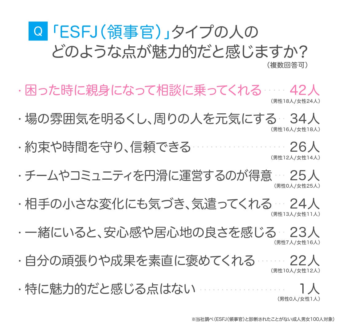 続いて、「ESFJ(領事官)と診断されたことがない成人男女100人」を対象に、ESFJ(領事官)のどのような点に魅力を感じるか尋ねました。