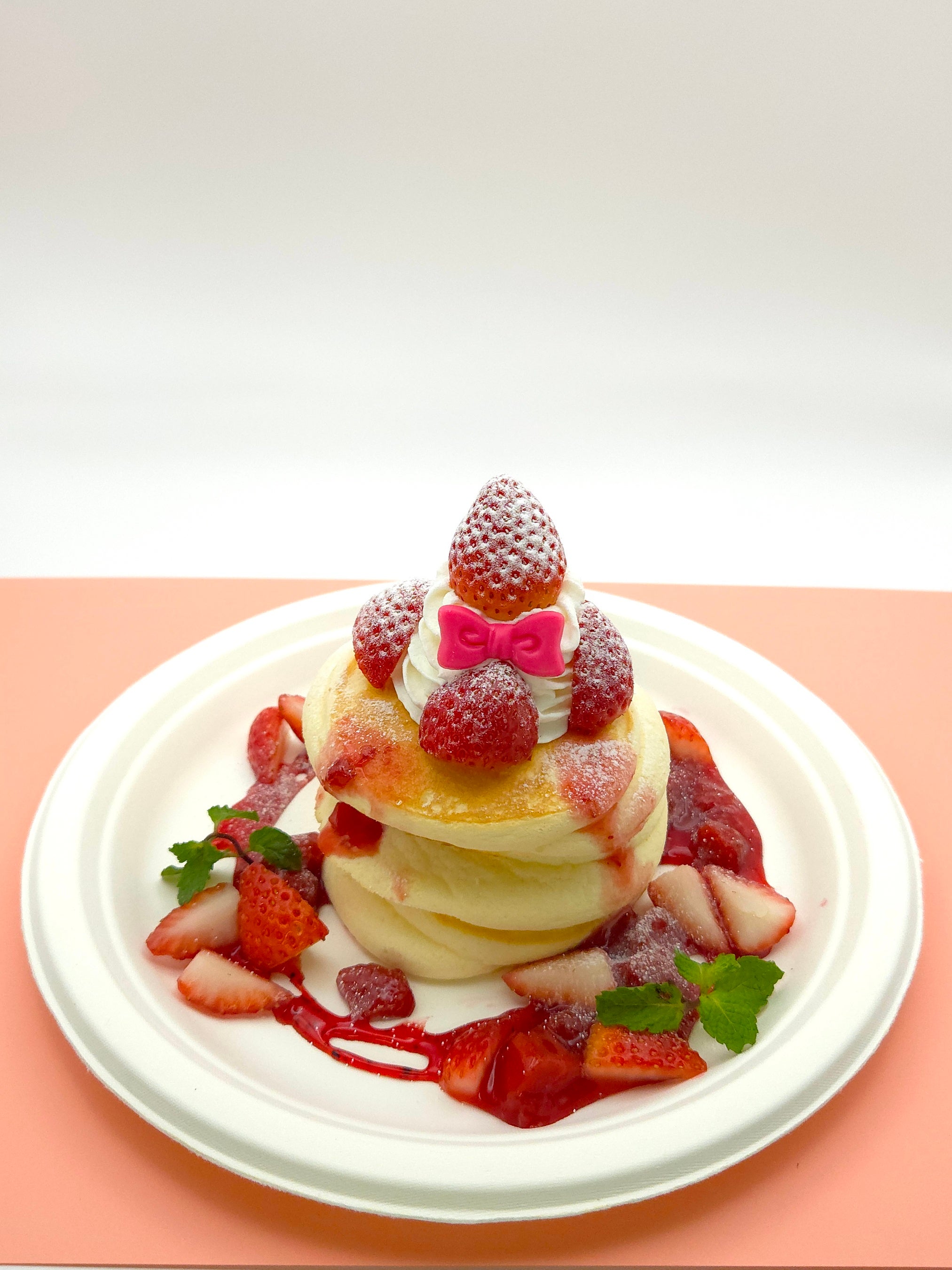 展望台をイメージして積み重ねたパンケーキに雲のようなホイップとたっぷり苺をトッピングしました!