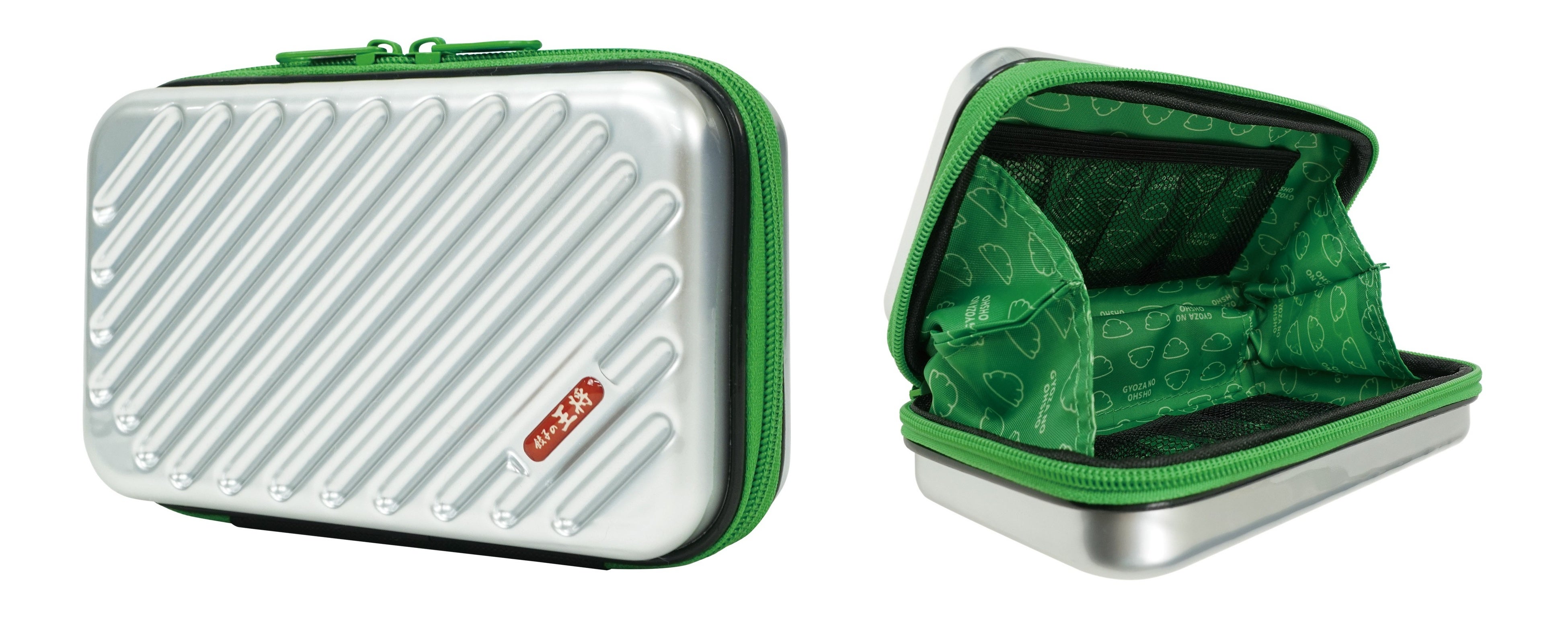 ハードポーチアタッシュケース風デザインのハードポーチです。外側がハードで中身が潰れにくく、持ち運びも安心。PC・スマホ周辺機器等ガジェット類の収納にもおすすめ。内側には餃子のイラストをあしらっています。
