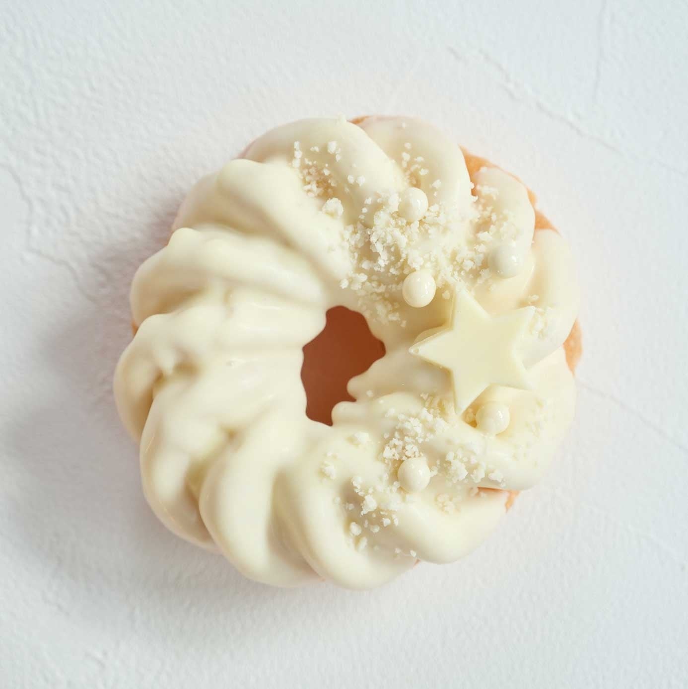 ホワイトスター 450円フレンチクルーラーのやわらかな食感にホワイトチョコをたっぷりとかけ、星型チョコ、ホワイトパールクラッカン、ホワイトクランチを散りばめました。