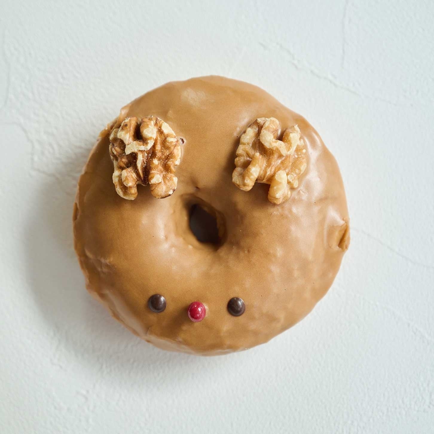 トナカイ 450円ブリオッシュ生地に香ばしいコーヒーアイシングをかけ、クルミをツノに、フランボワーズ味のパールクラッカンを赤い鼻に見立てた、愛らしいトナカイドーナツ。
