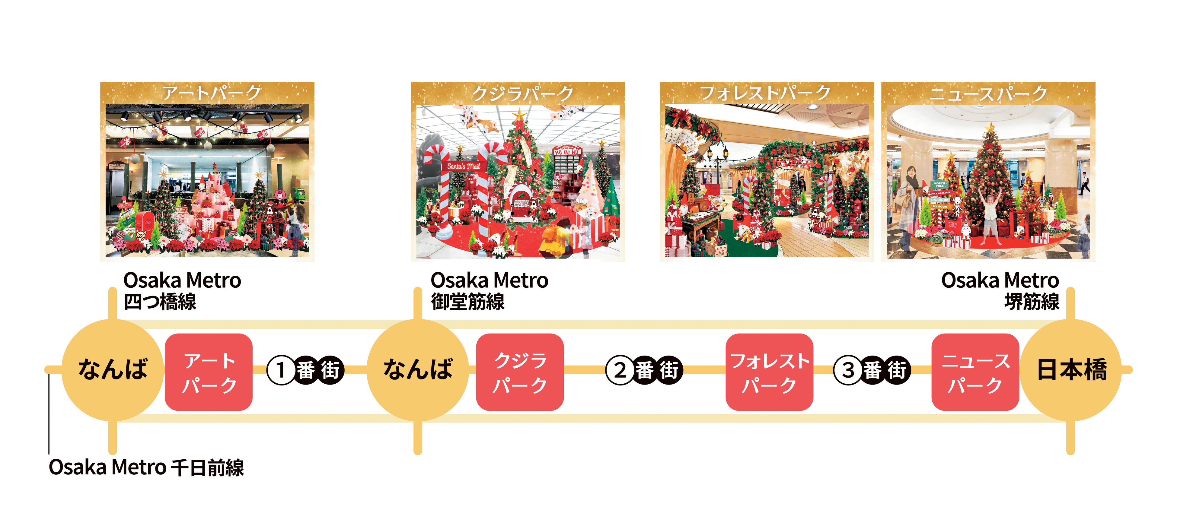 大阪メトロ御堂筋線「なんば駅」を基軸に東西延長715mにおよぶ「なんばウォーク」は、東端の地下鉄「日本橋駅」から西はJR「難波駅」までをまっすぐ結ぶ1本のショッピングストリートです。北通り南通りの2本の通路で構成された街は大きく3つのゾーンに区分けされ、「アートパーク」「クジラパーク」「フォレストパーク」「ニュースパーク」など4つの広場では季節ごとのイベントが行われています。