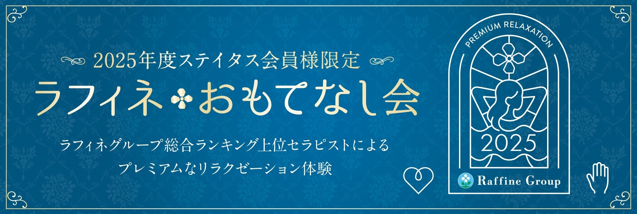 「ラフィネ」および姉妹ブランドでの年間ご利用金額に応じてお得な特典が受けられる会員ランクサービスです。ステイタス会員様には、メンバーズカードのステイタスポイントや優待券、限定クーポンの贈呈、特別イベントへのご招待など、より上質なリラクゼーション体験をお楽しみいただけるサービスをご用意しております。