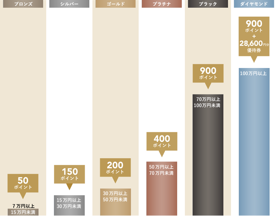 ※1月1日~12月31日の1年間のご利用金額に応じ「ステイタスランク」が決定し、翌年度4月1日~3月31日までの1年間それぞれのランクに応じた特典を受ける事が出来ます。