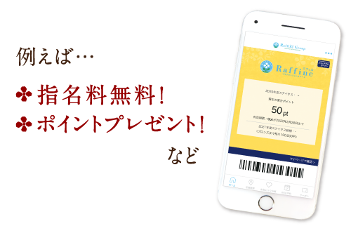 特典1.ポイントがもらえる!ステイタスランク別ポイントは、通常のメンバーズカードポイントと同様に施術代金や公式通販サイト「ラフィネマルシェ」にてご利用いただけます。
