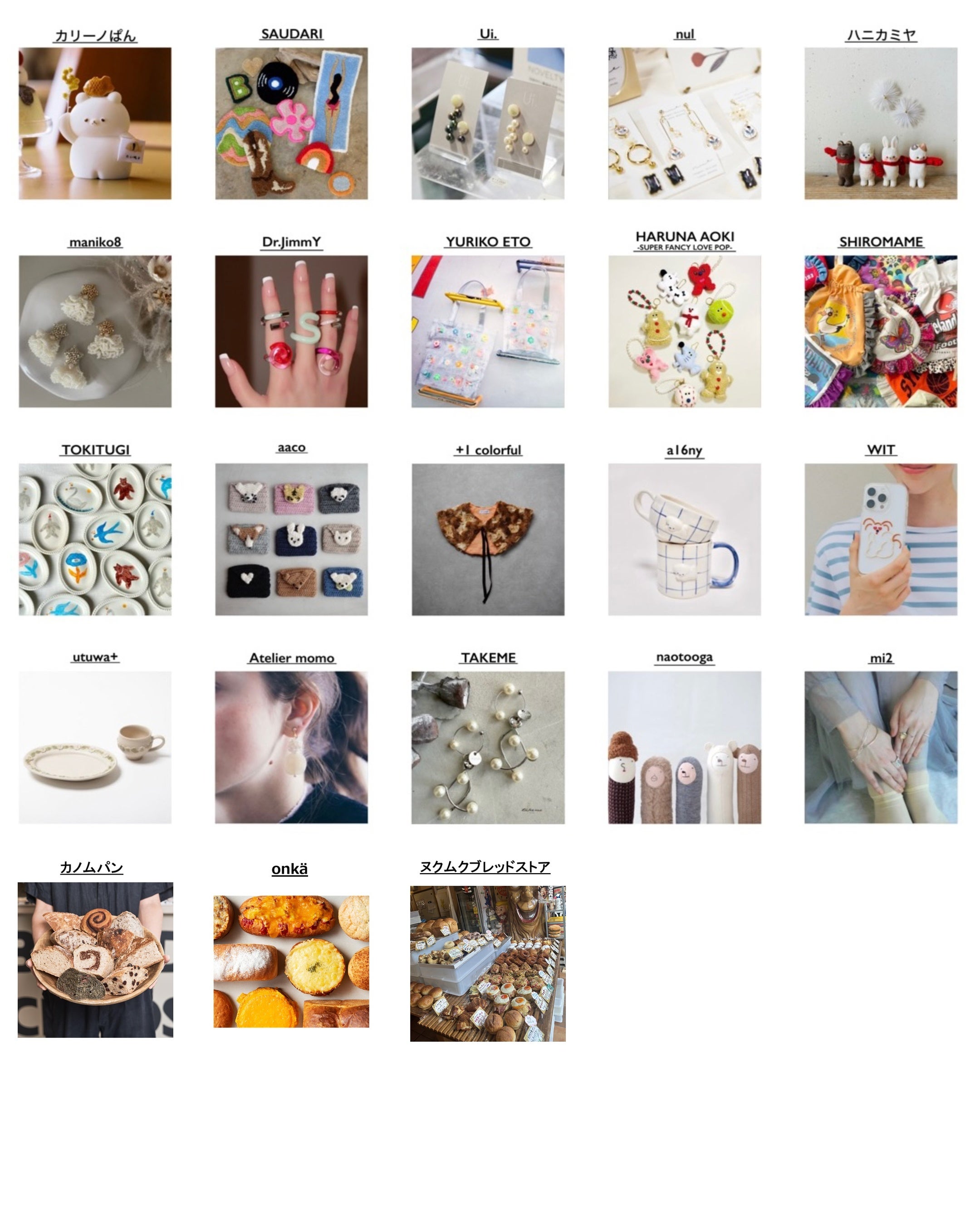 人気エリア『Marche Booth』は人気ハンドメイド作家や陶芸家が選りすぐりで出店!かわいいものと言うのも理由があって、FUDGE Christmas Marketに出店するSHOPはすべてFUDGEのバイヤーがスカウトしたブランドのみなんです!雑誌にはあまり登場しない陶器やハンドメイドの雑貨もたくさんあるのもポイント(ハート)FUDGEのバイヤーお墨付きのSHOPが集まるので、かわいい&おしゃれは間違いなし!また今年はパンや焼菓子のSHOPも出店。お買い物の後にはおいしいパンでお腹も心も満たしては?Marche Booth 出展ブランド