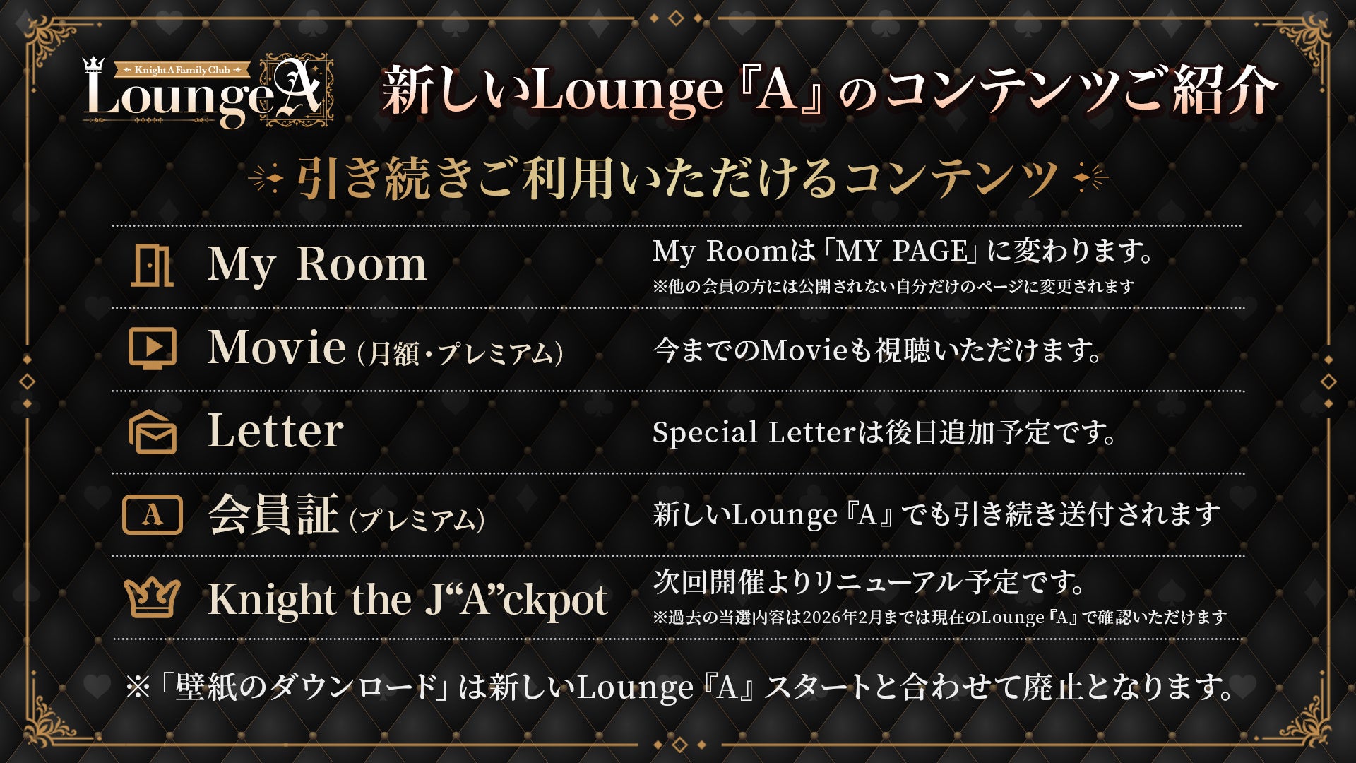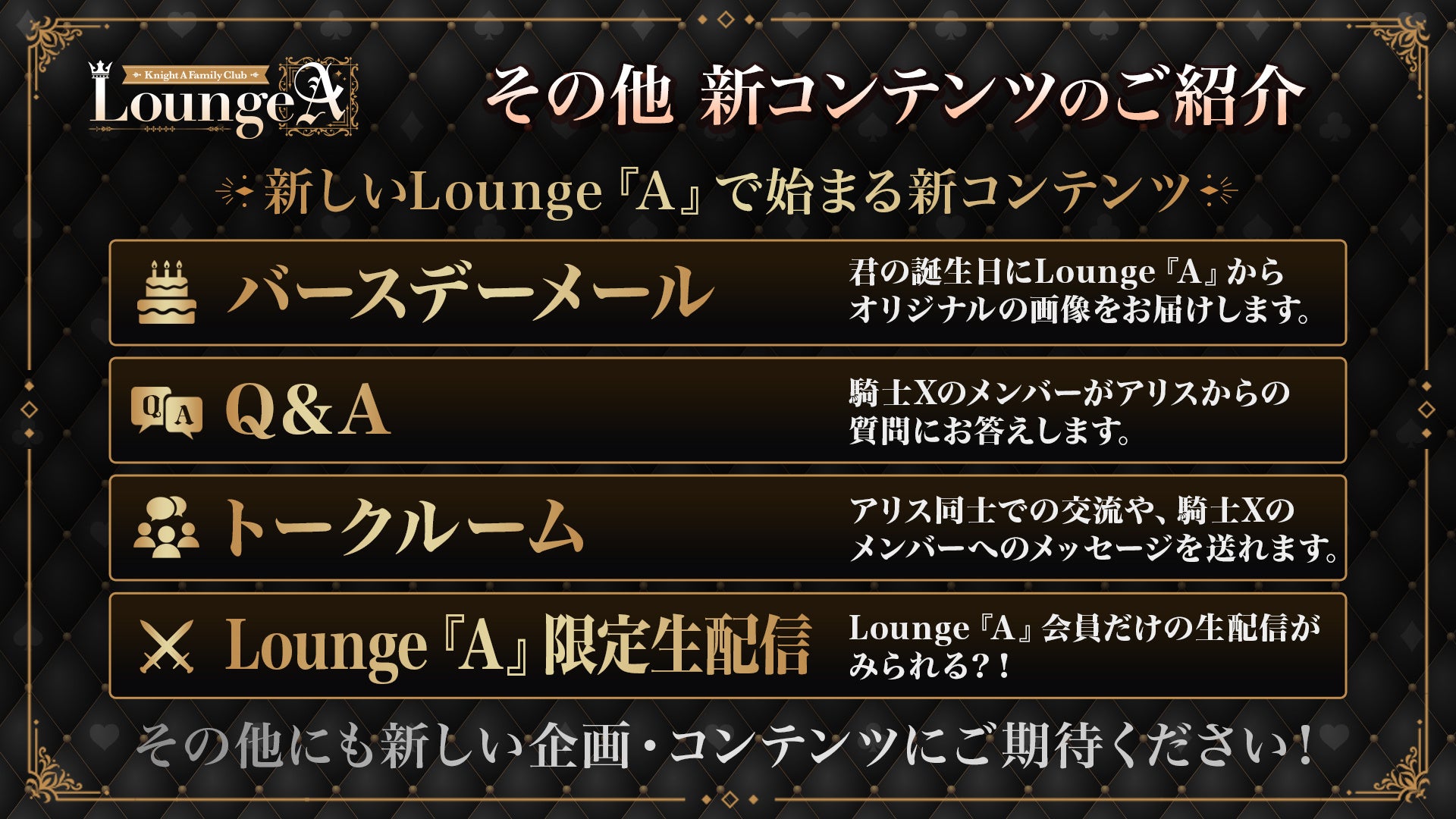 ゲームコンテンツ「Knight the “A”rcade」、誕生日にメッセージが届く「バースデーメール」、会員同士で交流できる「トークルーム」、メンバー出演による「Lounge『A』限定生配信」などの新コンテンツを導入しました。これらに加え、「Movie」「Letter」などの既存コンテンツも引き続き利用でき、会員の皆さまが日常の中で「騎士X」をより身近に感じられる体験が増え、さらに楽しめるファンクラブへと進化いたしました。