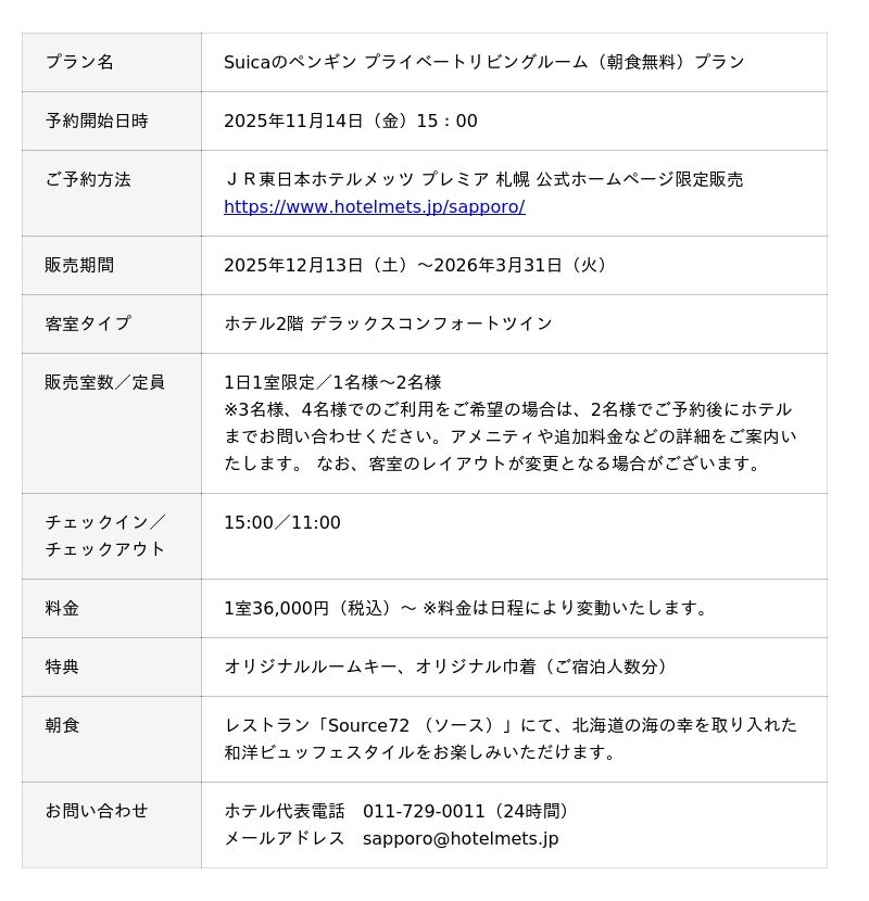 JR札幌駅より徒歩2分の「JR東日本ホテルメッツ プレミア 札幌」(運営:日本ホテル株式会社 JR東日本ホテルメッツ本部)では、Suicaのペンギンと過ごす特別なコンセプトルーム「Suicaのペンギン プライベートリビングルーム」を2025年12月13日(土)より期間限定で販売いたします。