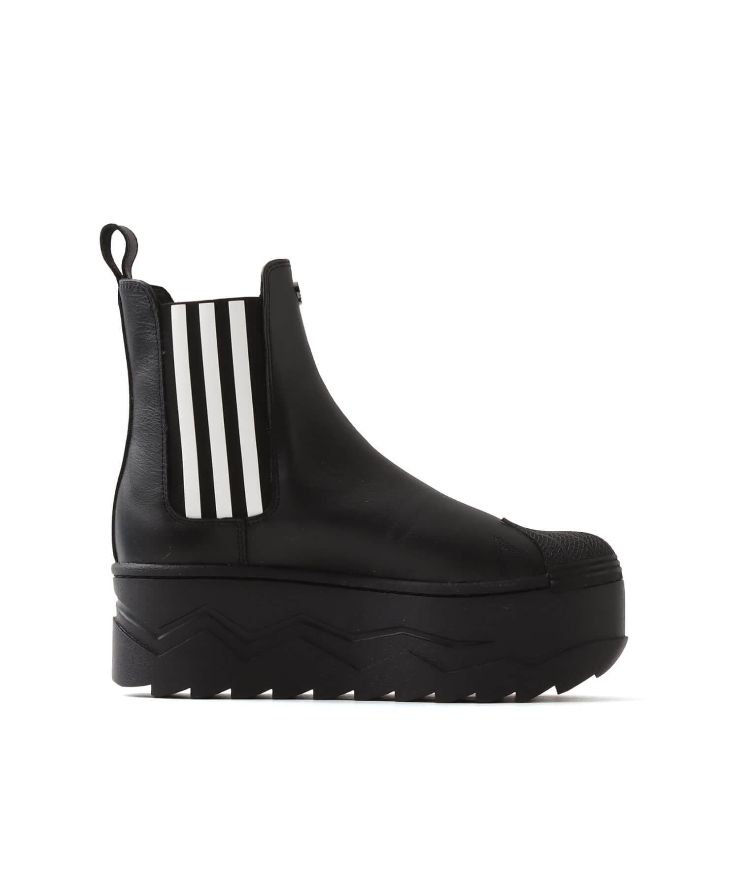 デザインを象徴するプラットホームソールに、『SUPERSTAR』ならではのシェルトゥ、そして、着脱しやすいサイドゴア仕様箇所にはアイコニックなスリーストライプスを配置し、フロントにはリッチな雰囲気を高めるシルバープレートのトレフォイルロゴが施されています。