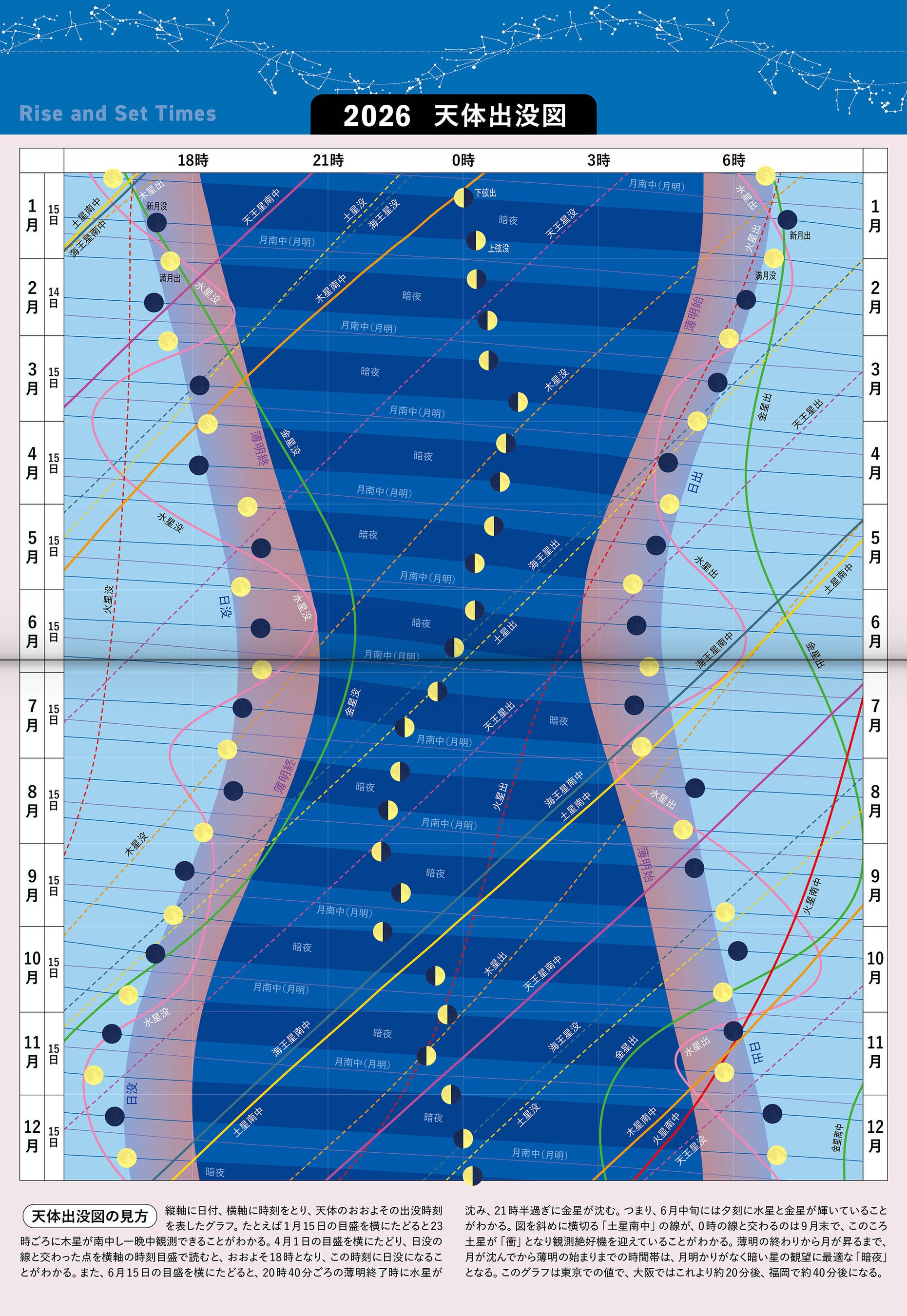 縦軸に日付、横軸に時刻をとって、天体のおおよその出没時刻を表した「天体出没図」