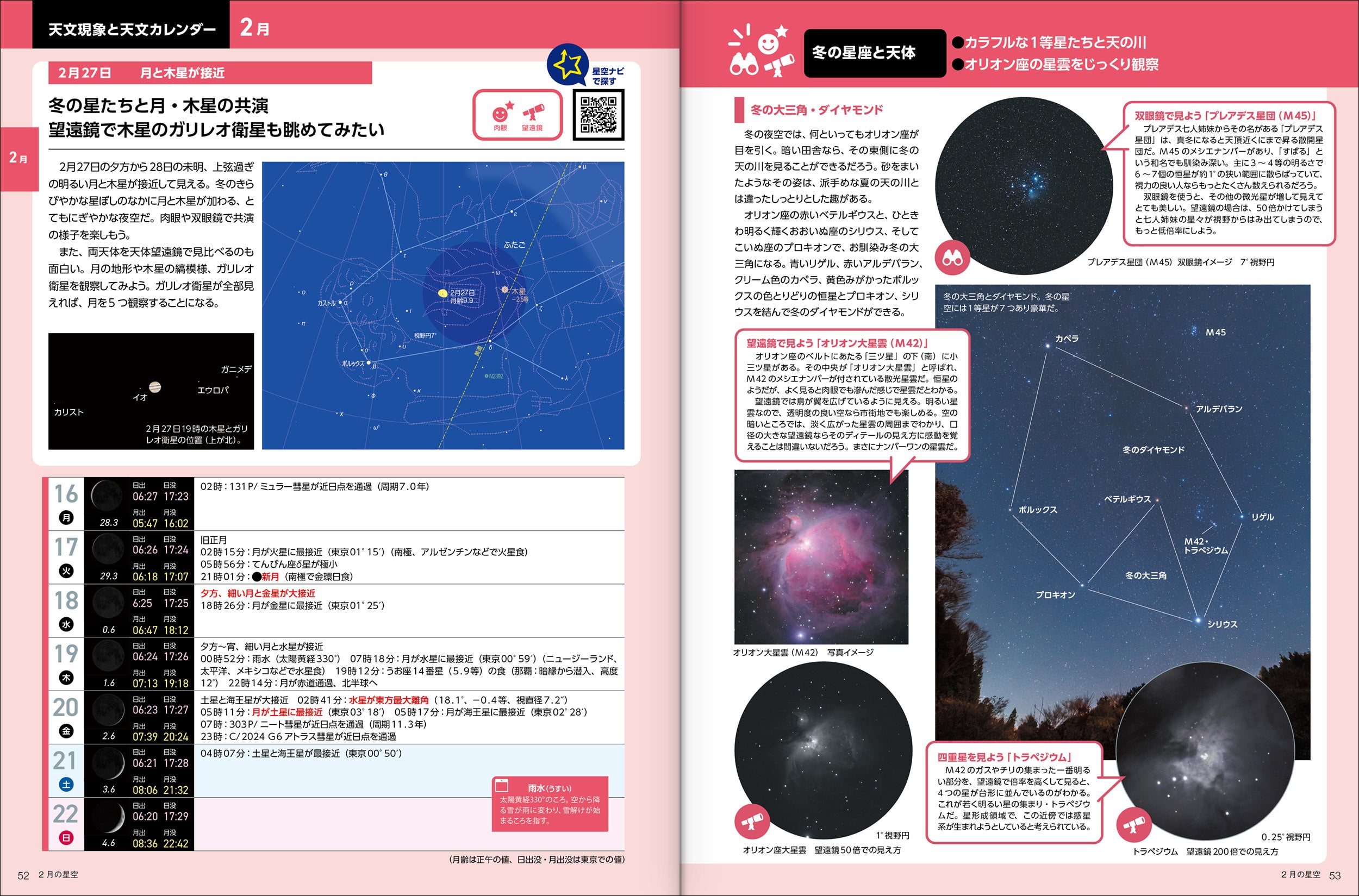 2026年注目現象の見どころや、毎月の星空の様子を先取りできます。特集記事では2026年に観望したい天文現象を写真とカラーCGイラストで解説。また、近年人気が高まっている「スマート望遠鏡」によるスマホでの観望の始め方も紹介しています。スマホアプリ「星空ナビ」があれば二次元コードを読み取って天文現象の方向を調べるなど、さらに便利に楽しめます。見ごろの星座・天体や二十四節気のコラムも掲載しています。