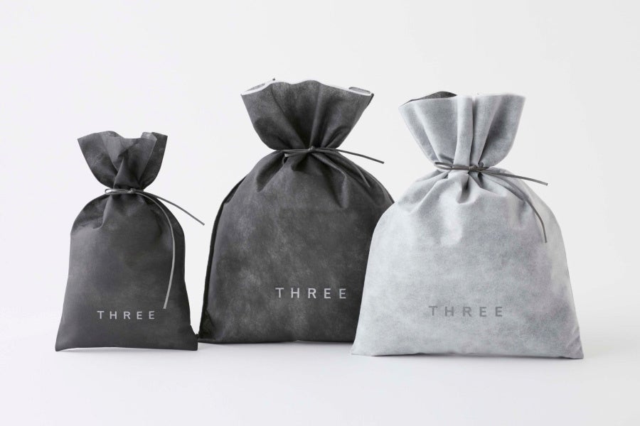 2サイズをご用意しています。THREE公式オンラインショップでは、ご購入商品に合わせて最適なサイズをお選びし、《バッグ(不織布)+タイのセット》をお届けいたします。
