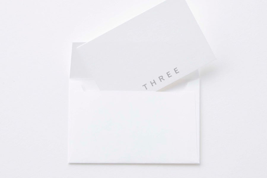 THREEのギフトラッピングは、どんなシーンにもお選びいただける、シンプルでエフォートレスなデザイン。古紙を40%以上を使用したリサイクルペーパーの質感が、洗練されたスリークさの中に上品な温もりを宿し、贈り手の想いをやさしく包みます。