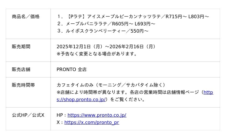 株式会社プロントコーポレーション(本社:東京都港区、代表取締役社長:杉山和弘)は、飲食チェーン『PRONTO(プロント)』のカフェタイム(モーニング/サカバタイム除く)にて、Pラテ「アイスメープルピーカンナッツラテ」を2025年12月1日(月)より発売します。「メープルバニララテ」「ルイボスクランベリーティー」も同時販売いたします。