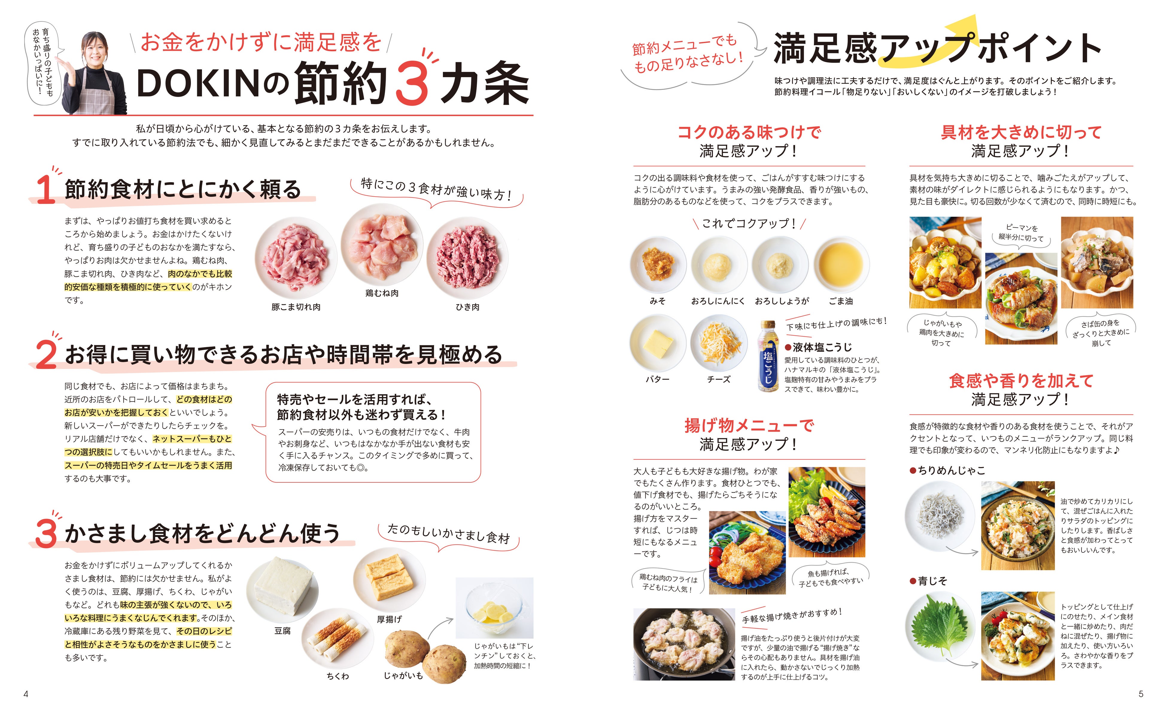 Instagramフォロワー数51万人越えの料理家・DOKINさんが食べ盛りの家族もよろこぶボリュームおかずのレシピ集。人気の定番レシピや節約しながらおいしく作れる食材別レシピまで262品掲載しています。節約のポイントは3つ。