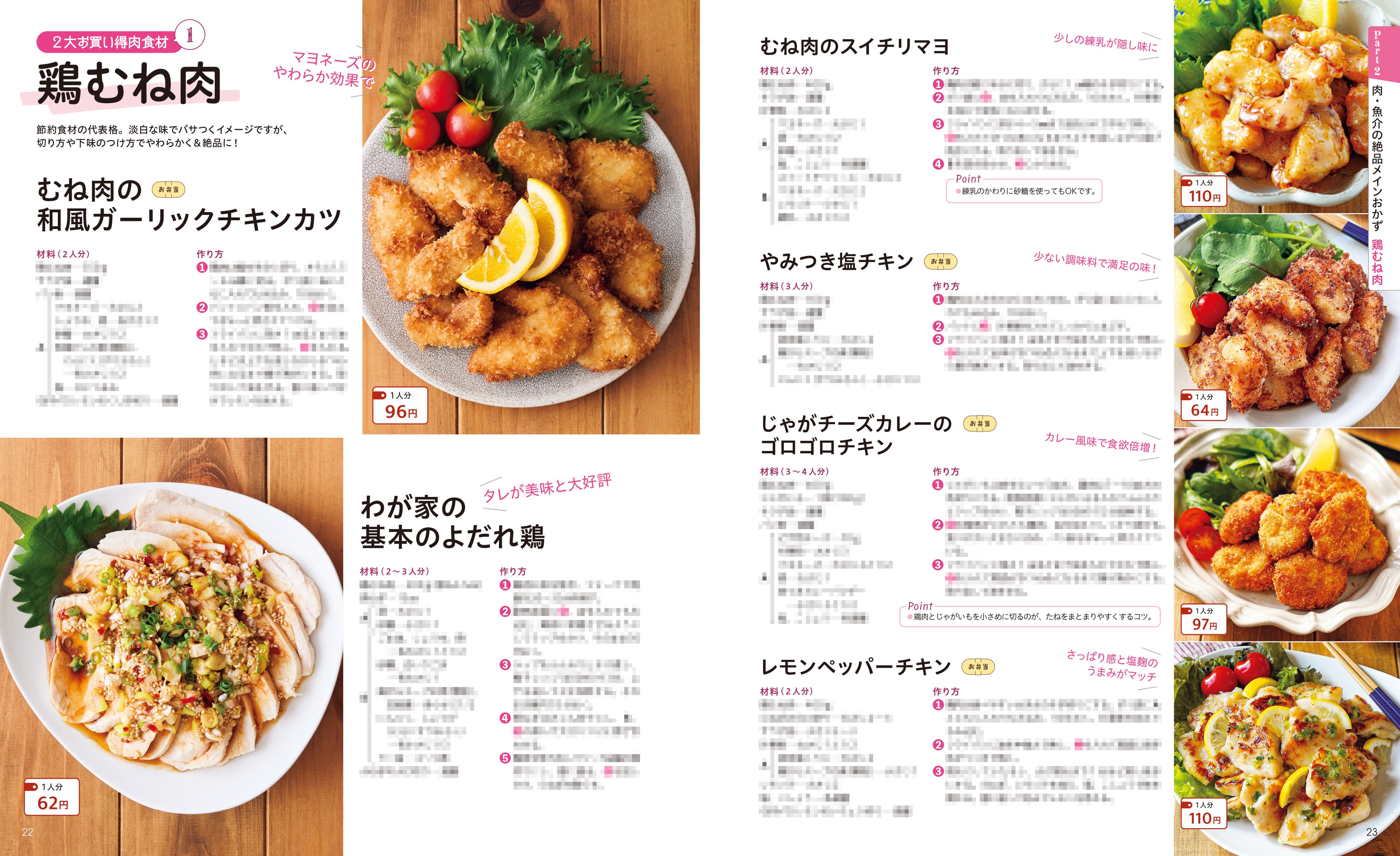 鶏むね肉、豚こま切れ肉、ひき肉など9種類の肉を使ったレシピに加え、さけやえびなどの魚介を使ったレシピを全58品掲載。
