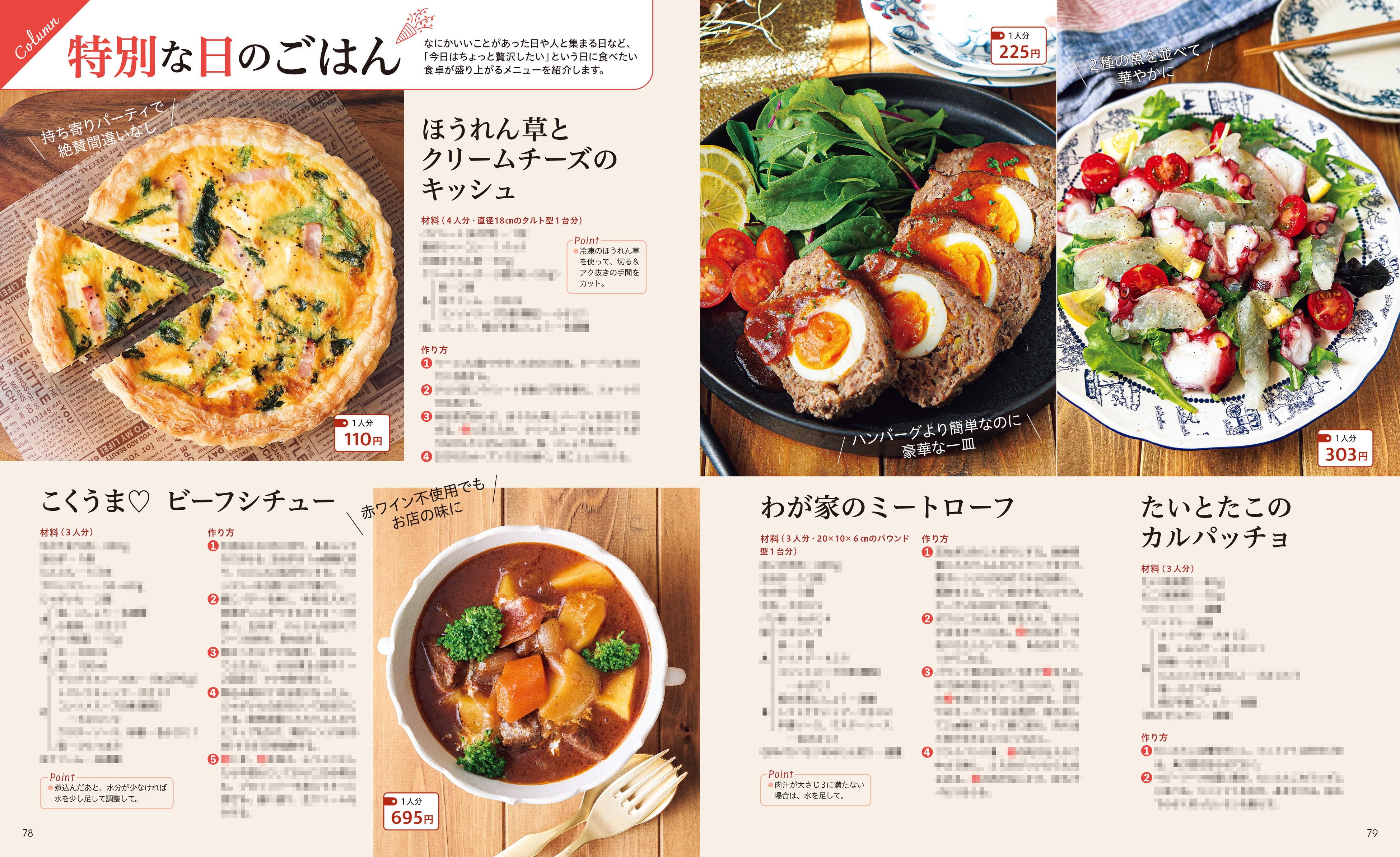 そのほか、ワンディッシュやスープ&汁物、ほっこり甘くておいしいおやつまで、毎日の食卓が楽しくなるレシピをたっぷり収録しています。