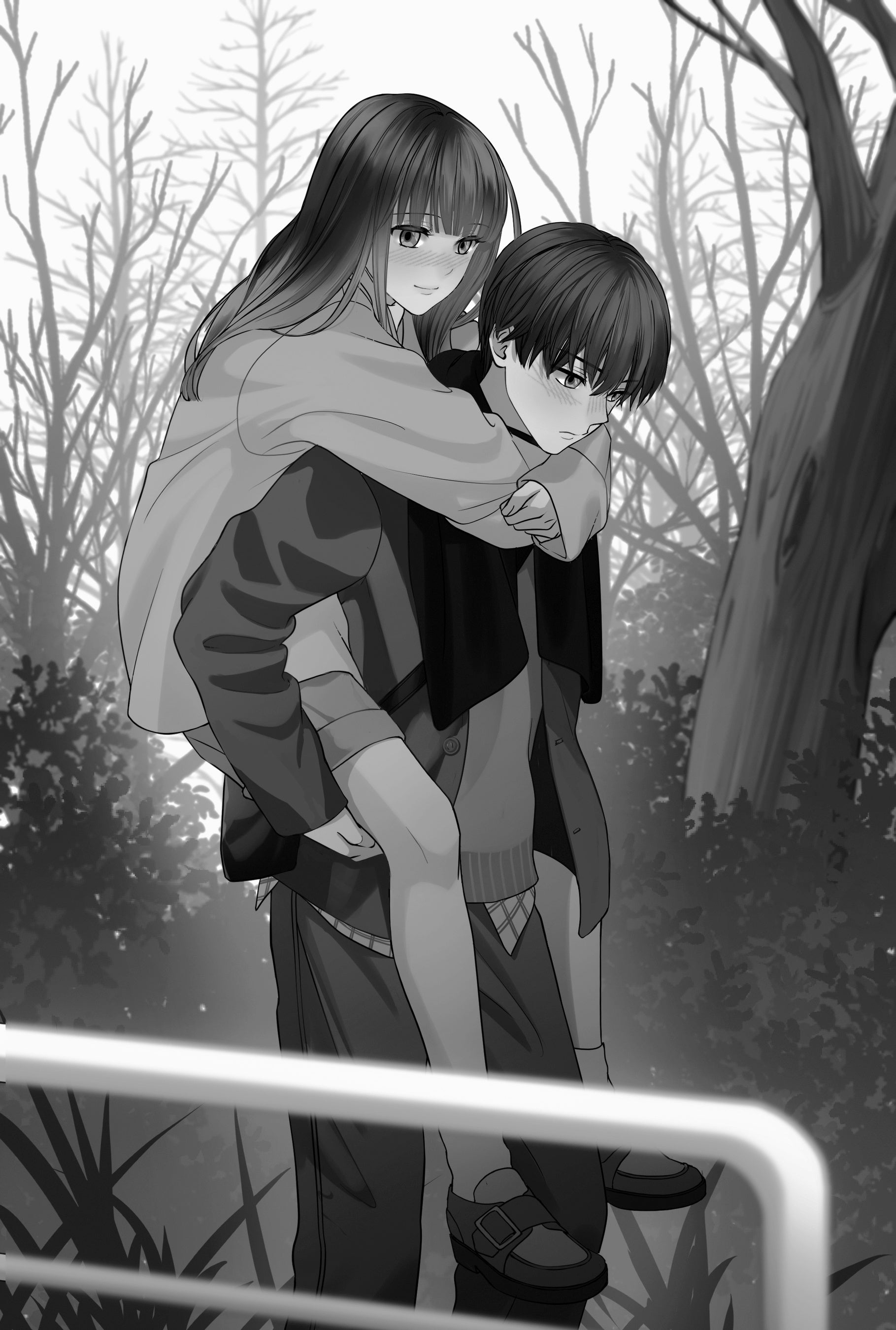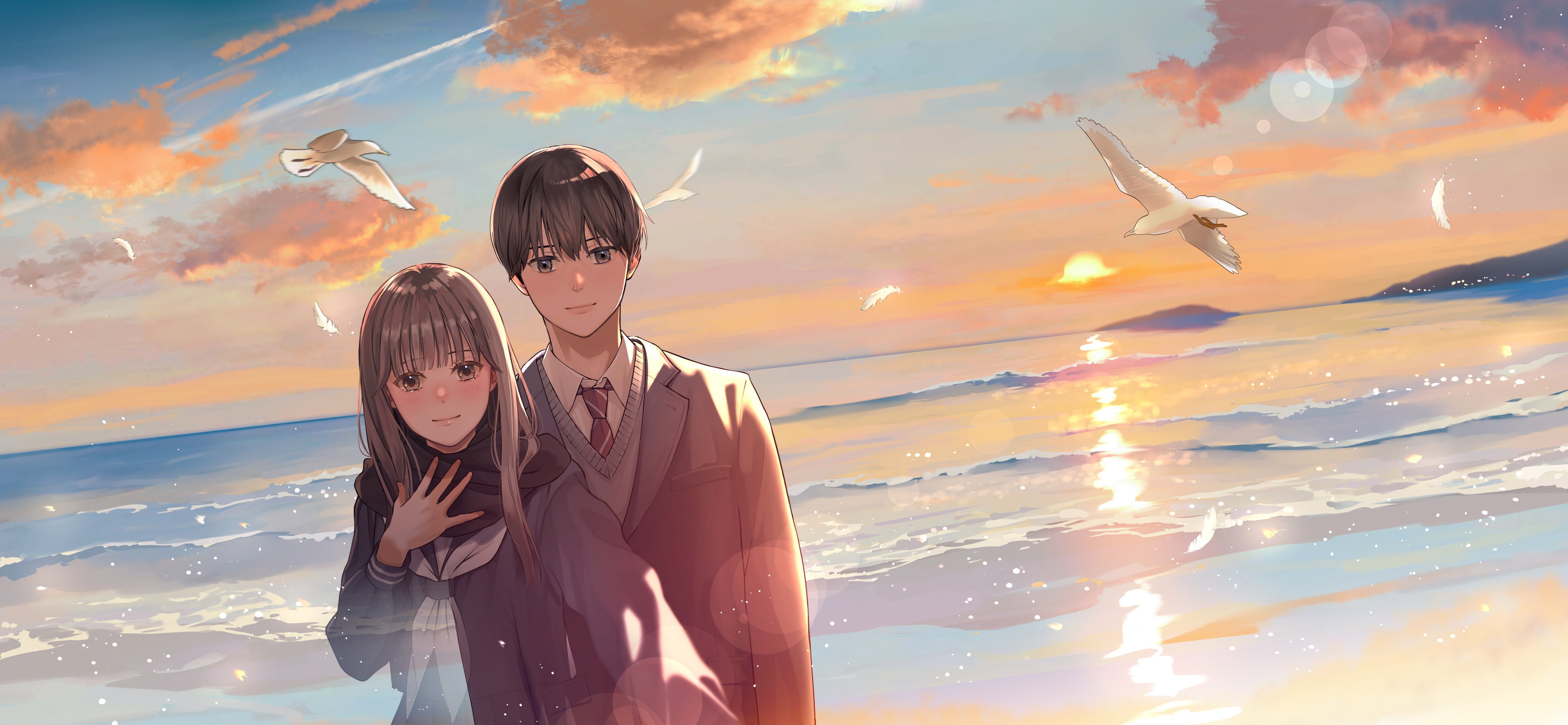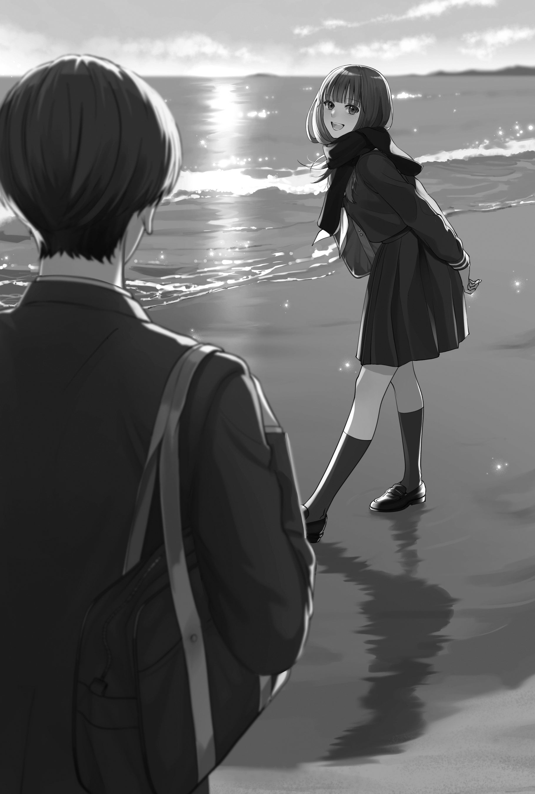 カバーイラストは、人気イラストレーター、まかろんKさんによるもの。ふたりで初めていっしょに訪れた思い出の海岸で、自撮りをするふたり。日の入り間近の夕焼けの背景が美しい。