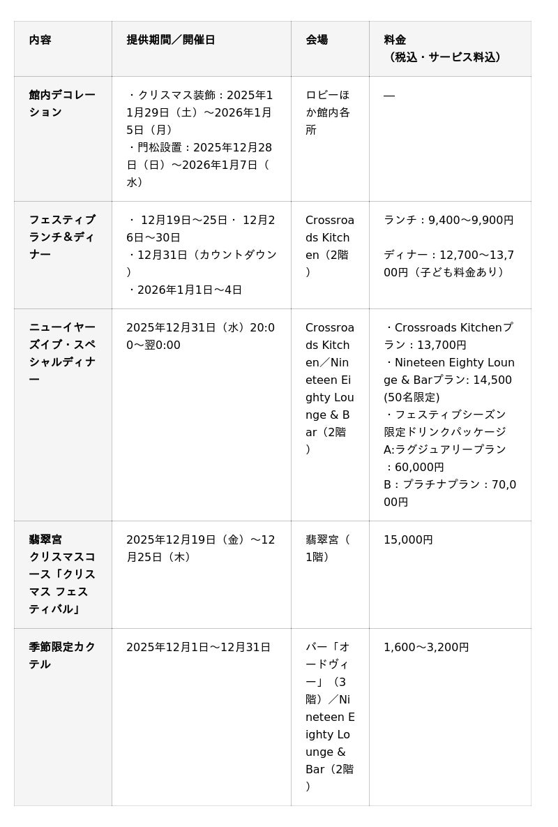 限定メニューやカウントダウンセレブレーションディナーなど全館がホリデーの装いに