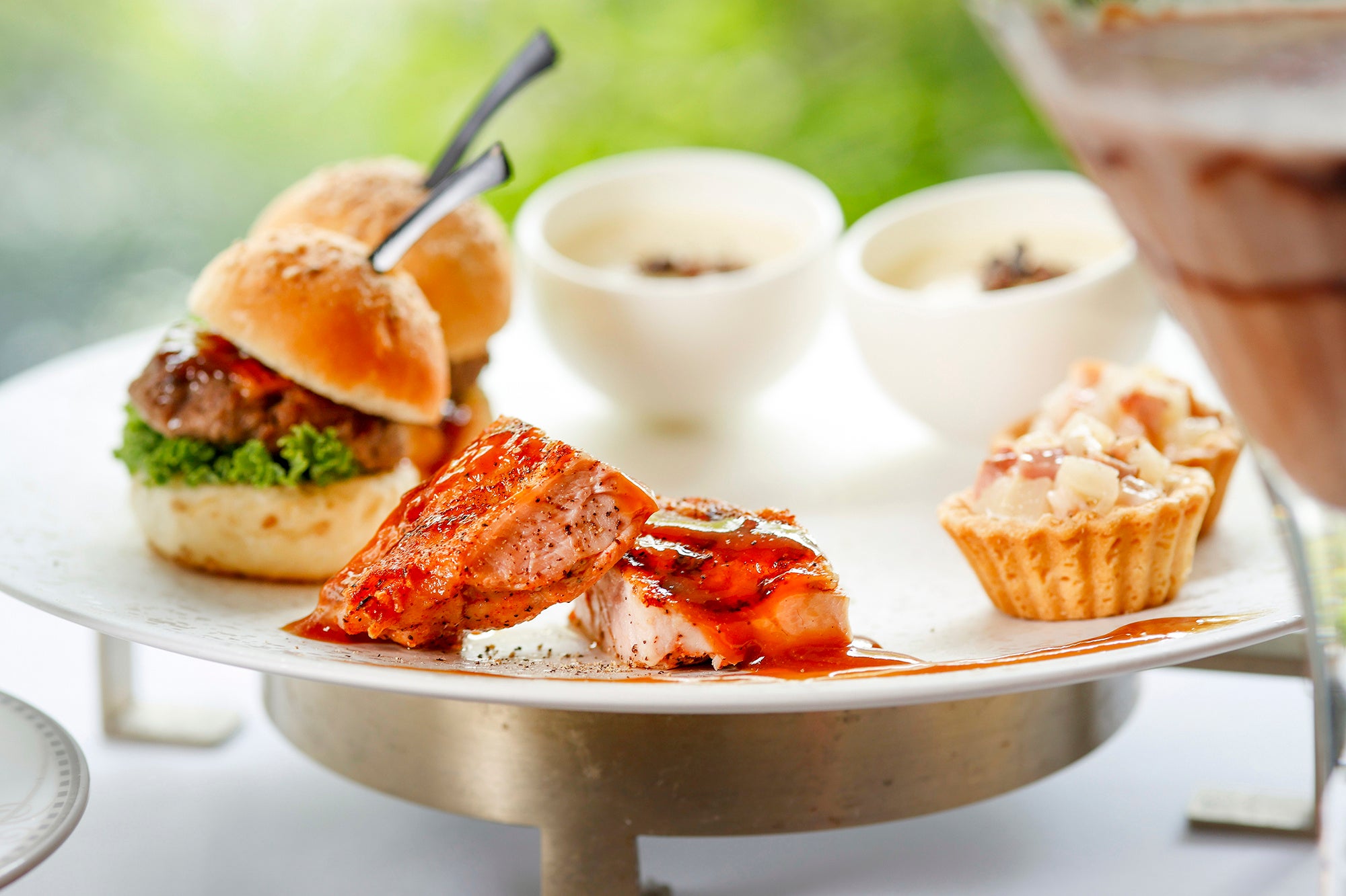 スイーツは、いちごを丸ごと一粒味わえるカヌレやゼリーのグラスデザート、甘酸っぱいいちごと濃厚なチョコレートのマリアージュを楽しめるタルトや艶めくムース、いちごとミルクチョコレートのガナッシュを挟んだクッキーサンドなど7種類がスタンドを彩ります。セイボリーは、旨味がつまったTAVERN特製のミニバーガーや、ホワイトチョコレートとカリフラワーのムース、香ばしい燻製鴨と洋梨のタルトレット、ピリッとスパイシーなチキンなど4種類がラインアップ。さらに、ラズベリーとビーツがアクセントになるサラダや、温かいポタージュも付いた、贅沢かつボリューム満点の内容でお届けいたします。