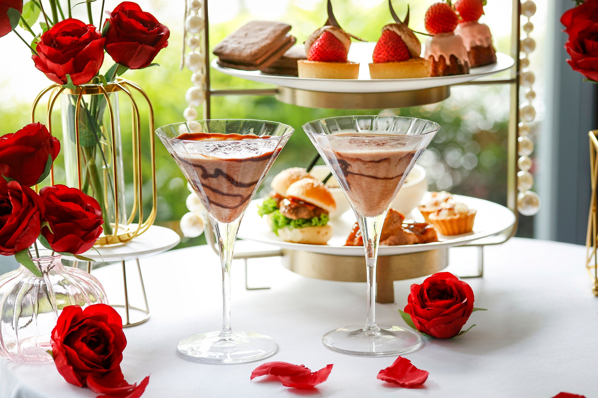 ニューヨークスタイルの洗練された感性が息づくTAVERN by the greenでは、赤をまとった贅沢なティータイムを過ごす大人の“Red Luxe(レッド・リュクス)”をテーマに、旬のいちごと濃厚ショコラが織りなすエレガントなアフタヌーンティーをご用意いたしました。アフタヌーンティースタンドは、煌めくパールとビジューをあしらった冬の装いで登場します。