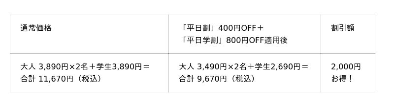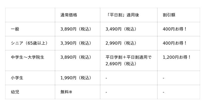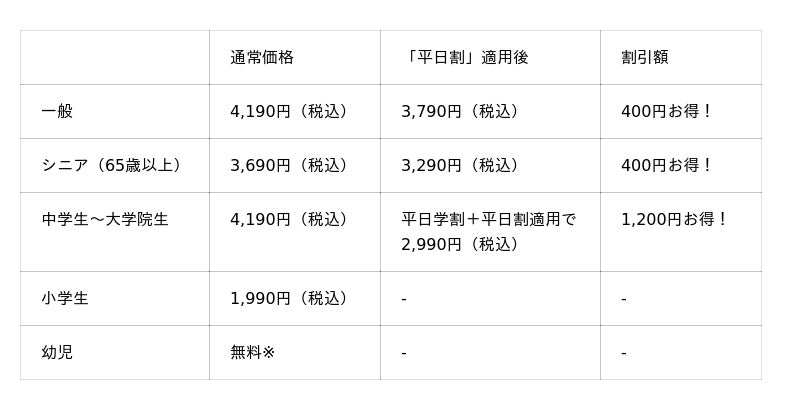 ※「平日割」の対象は一般・シニア料金のお客様です。※「平日割」・「平日学割」はキャンペーン開催期間中の土日・祝を除く平日のみが割引適用となります。※幼児は保護者1名様につき幼児2名様まで。3名様以上は1名様につき990円(税込)頂戴いたします。※学割は学生証ご提示の本人に限り有効です。