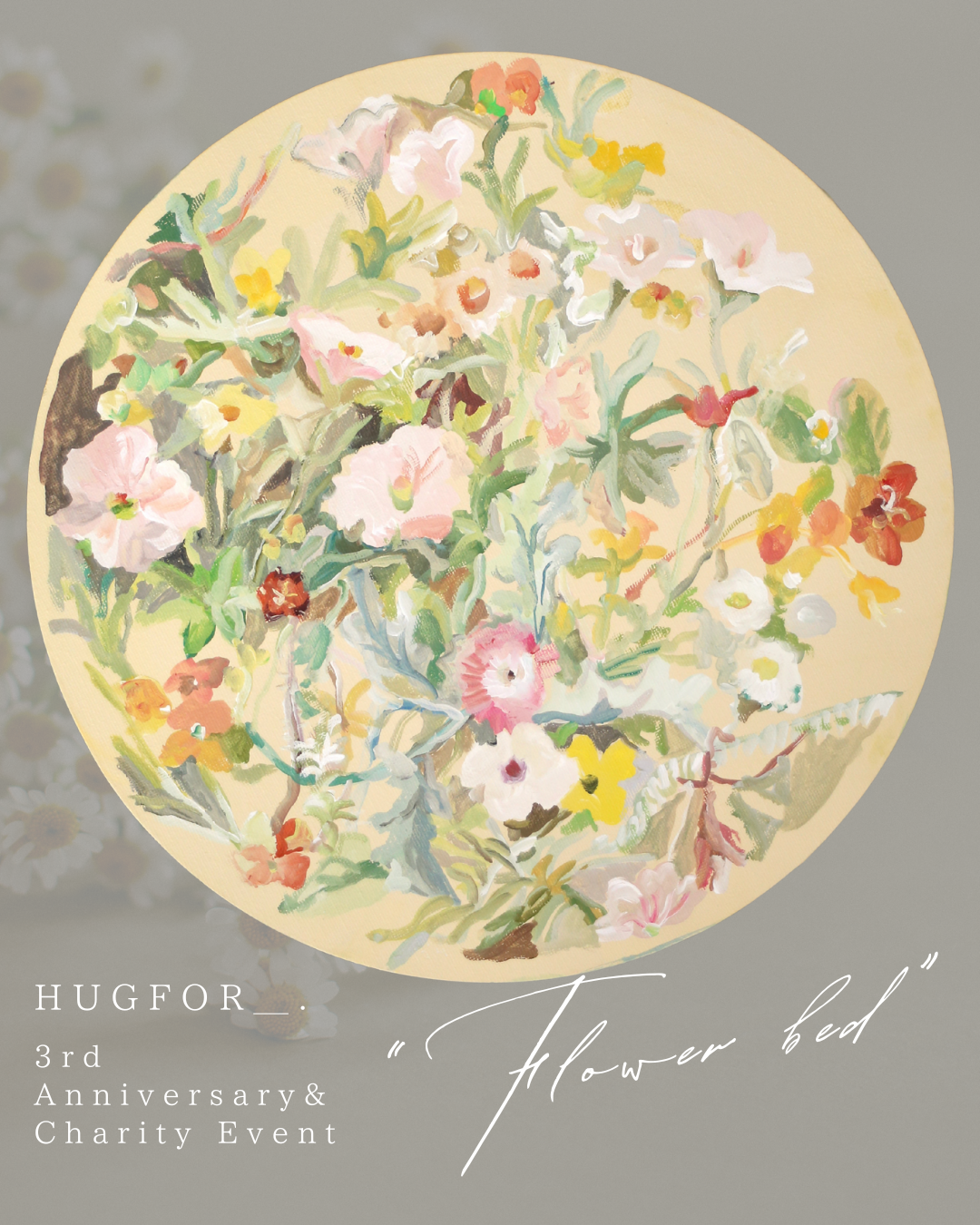 HUG FOR _. は、2025年12月で3周年を迎えます。この節目として、2025年12月6日(土)に HUG FOR _. 3rd Anniversary & Charity Event「Flower bed」 を開催いたします。当日は、アーティスト 庄島歩音による新作の発表と、色とりどりの植物や鳥が描かれた記念品の布パッチを会場にて多数展示、販売いたします。