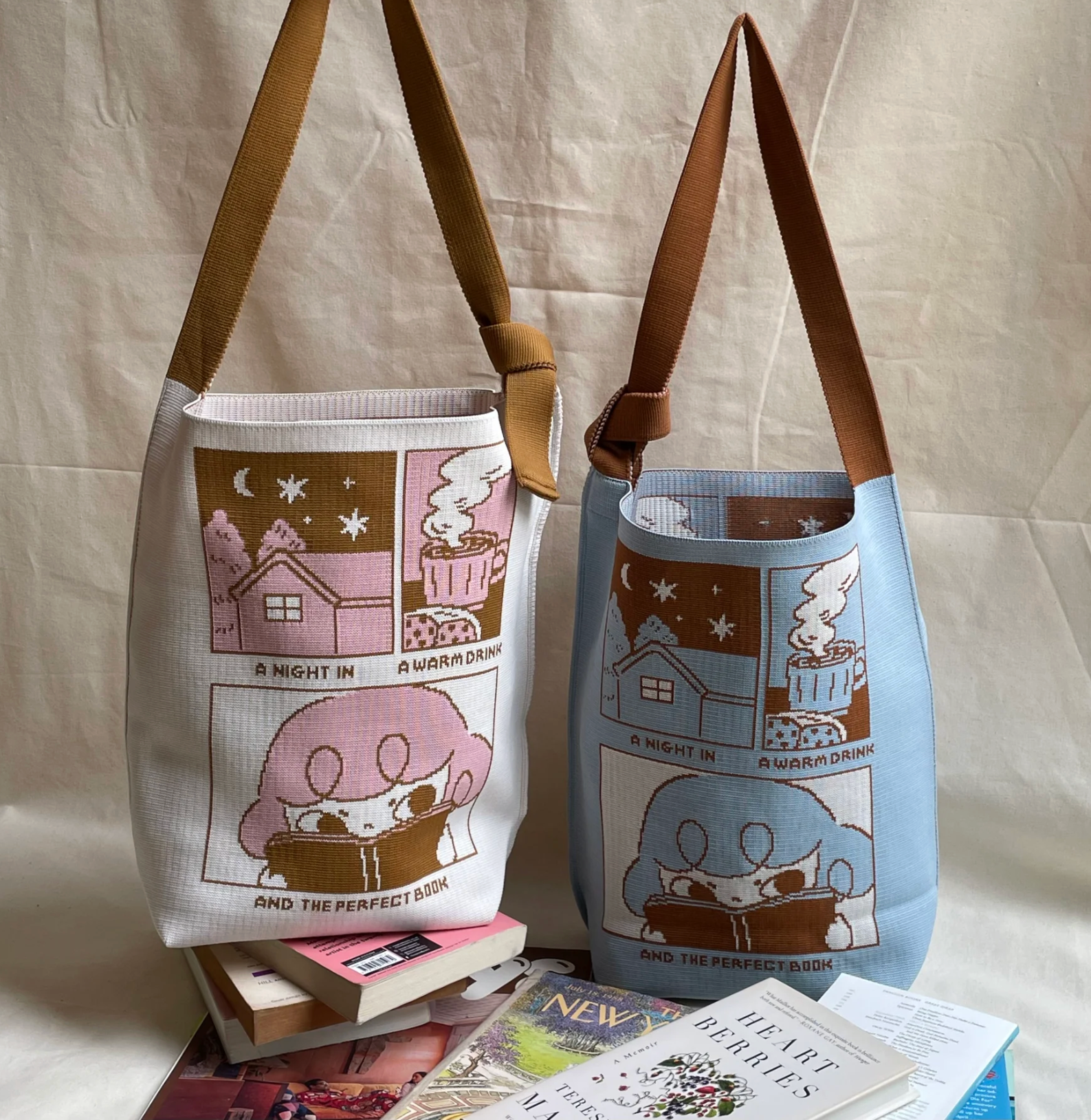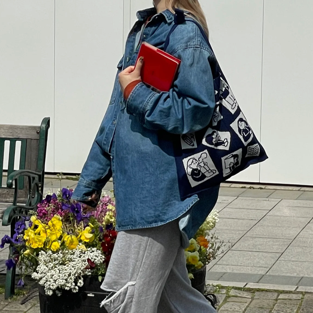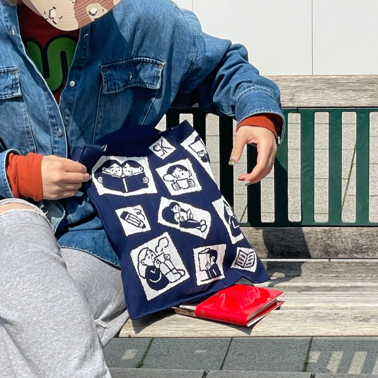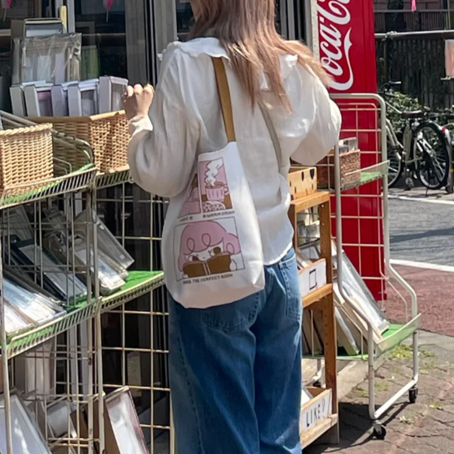 Fourty同様読書をしているイラストや、ホットドリンクを飲んで一息ついているイラストが、癒される作品です。シンプルな配色とイラストが特徴なのでどんな服装にも馴染みます。