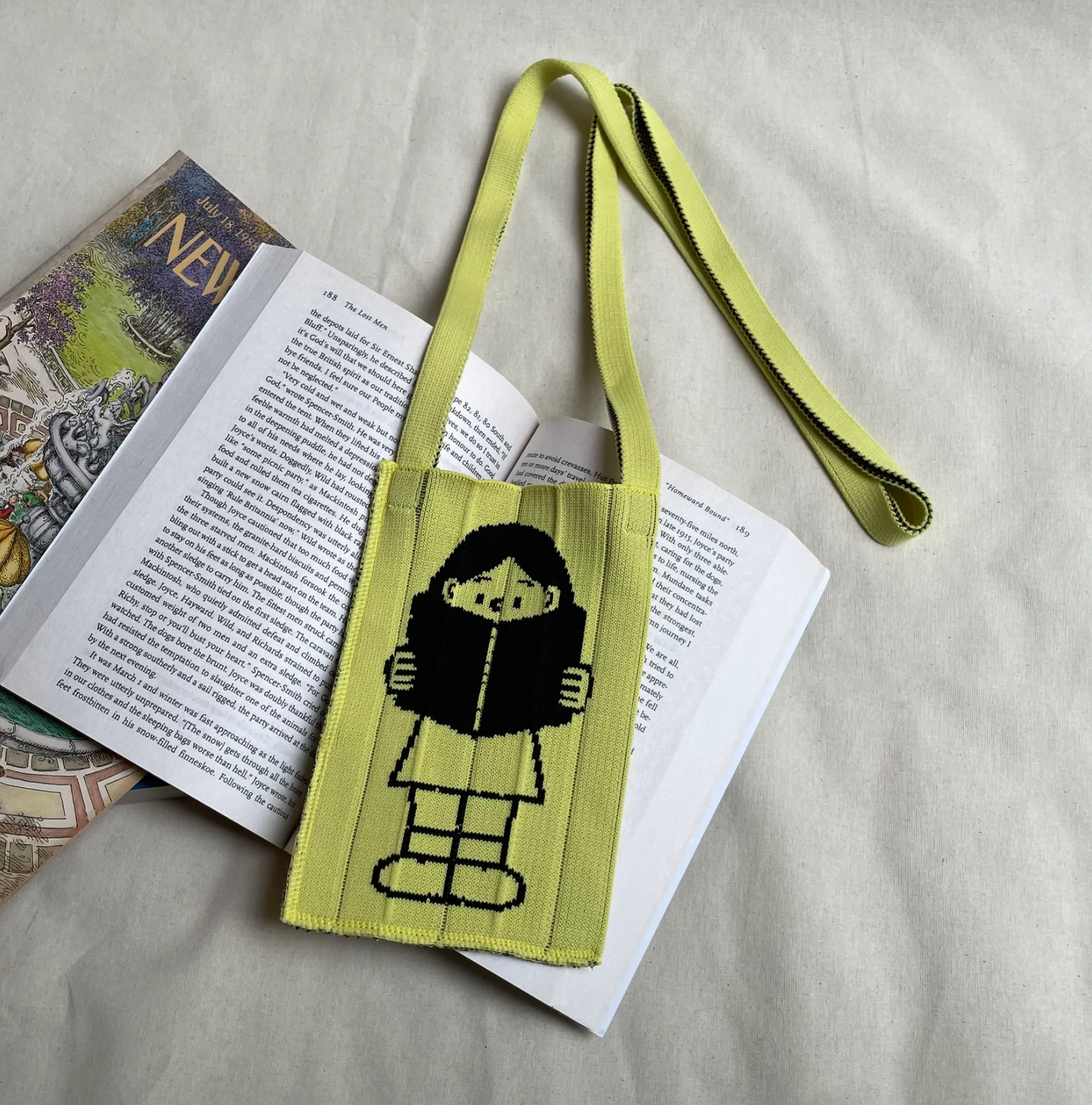 スマートフォンやリップなどの小物を持ち運ぶのにぴったりな「Me-Knitty」は、鮮やかなイエローの糸を使用。シンプルながらも、服装のアクセントになる存在感のある作品に仕上がっています。
