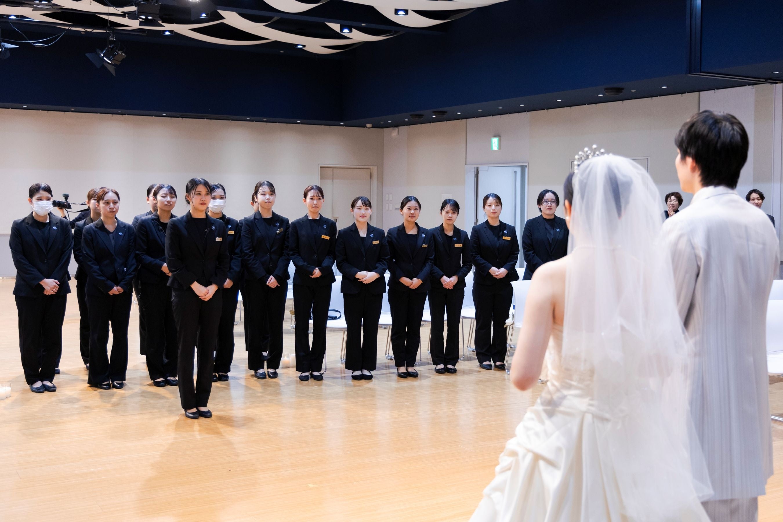 今年4月から7か月間にわたり、ブライダル科の学生が、主役となる夫妻と面談を重ね、夫妻が望むテーマに沿った演出プランをもとに、式の構成起案、ヘアメイクやドレス選び、ロケーションフォトの撮影などを実施してきました。式当日には、学生自ら進行管理や空間演出を行い、“模擬”ではなく、“本物”の結婚式のプロデュース全般をテクノスカレッジの学生が担います。