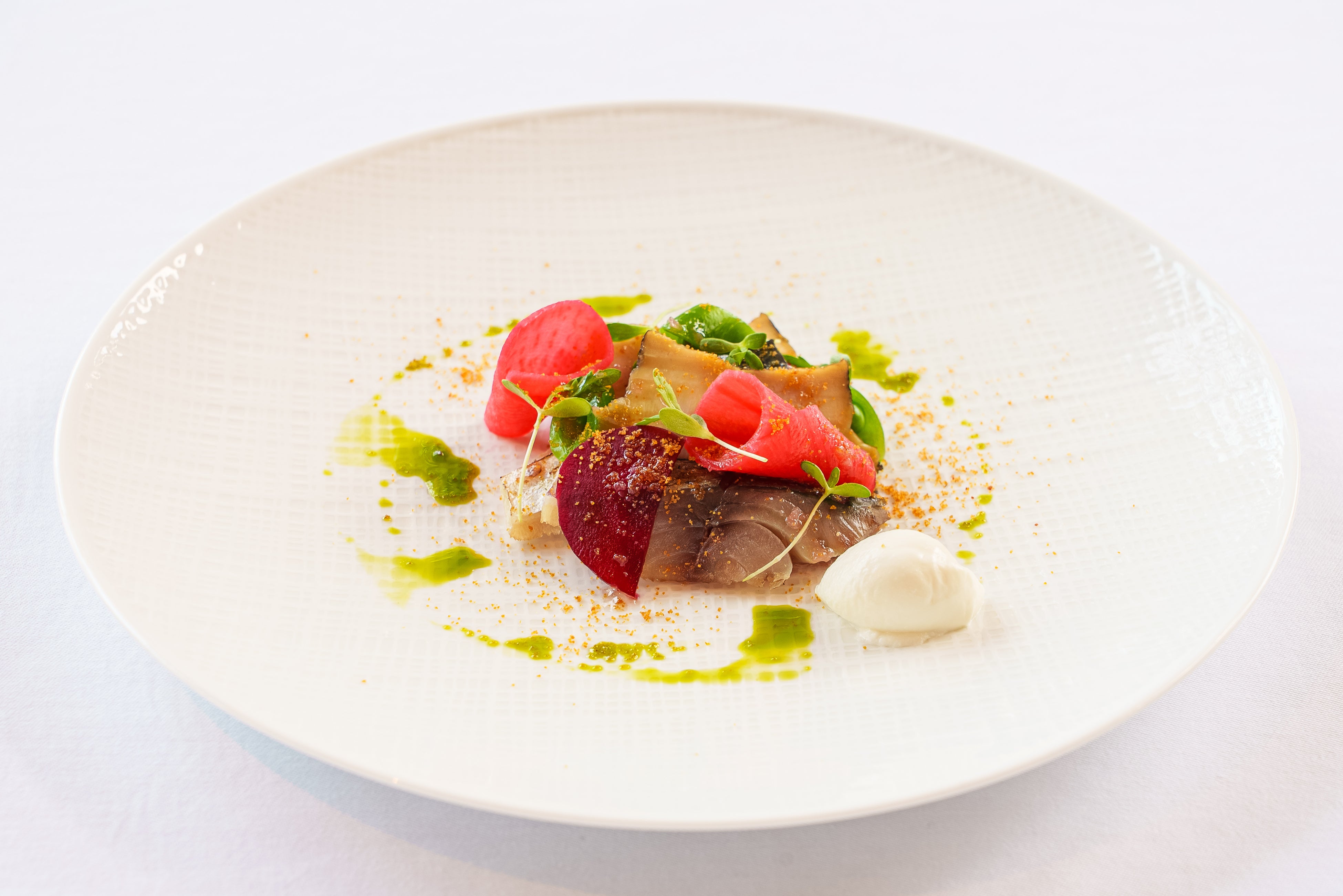 脂がのった近海で獲れる真鯖をマリネした後、森の中のダイニングを感じていただけるようなスモーキーな香りをまとわせました。濃厚な味わいの真鯖と柔らかな食感の蒸し鮑、存在感ある香りを放つ春菊、そして酸味とコクが特徴のフロマージュブランとの意外なマリアージュをご堪能ください。
