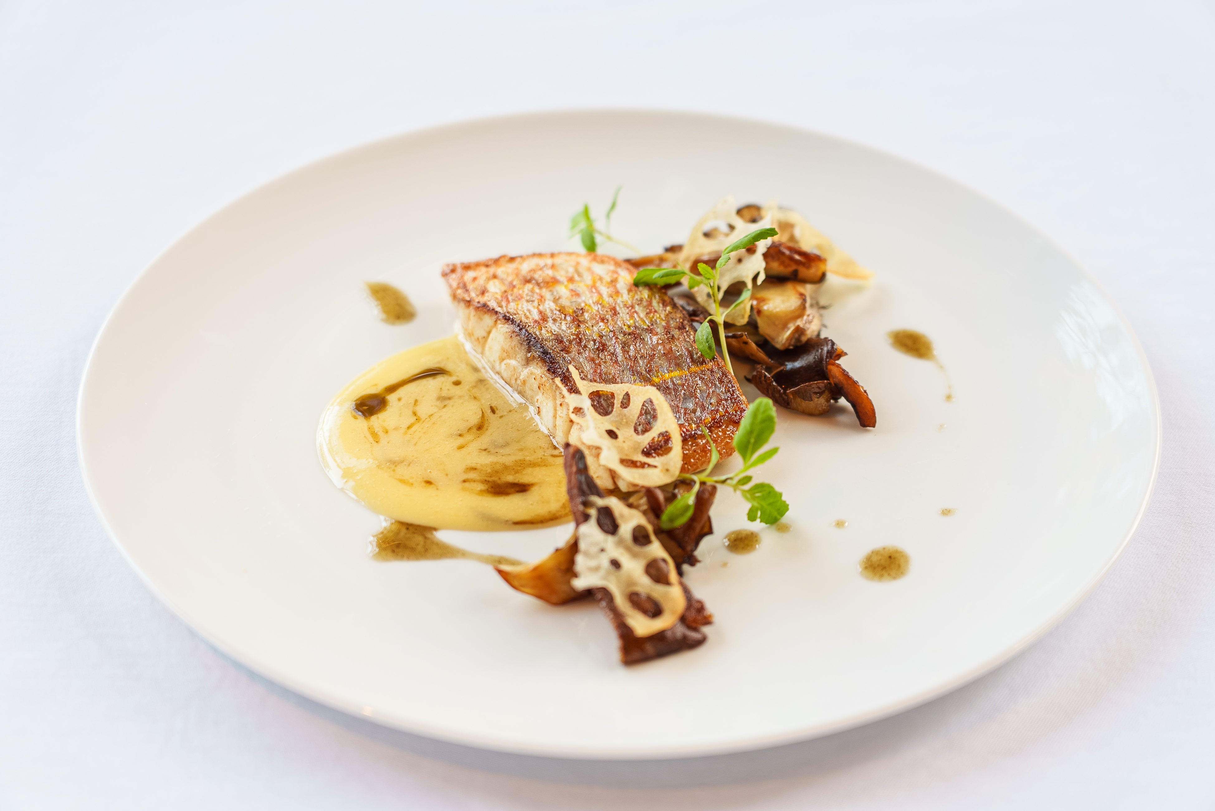 近隣漁港で水揚げされたばかりの新鮮な魚を、中はふっくらと皮目はパリッと丁寧に焼き上げました。豊かな香りとほんのりとした苦みを楽しめるドライベルモットを使用したクリームソースにまろやかな甘みとコクが特徴の黒オリーブをアクセントにしました。