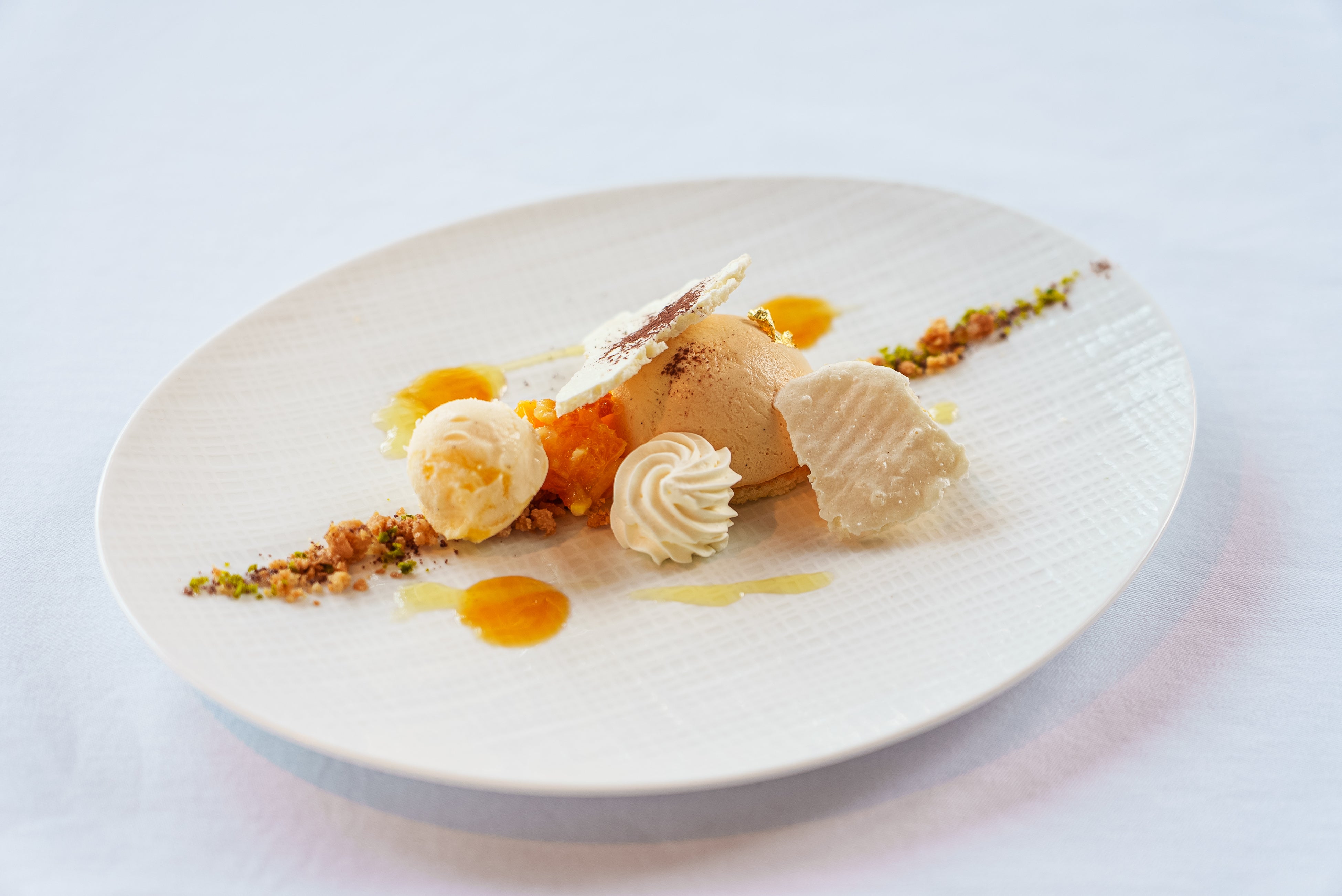 その時期に一番おいしい品種の地元産柑橘をセレクトし、優しい甘さのシロップで煮詰めました。しっかり焼き込んだメレンゲ、香ばしさが魅力のキャラメルムースと爽やかな柑橘との抜群の相性をお楽しみください。柑橘シャーベット&バニラのマーブルアイスと、味覚のポイントとして使用されたオリーブオイルが全体に清涼感をプラスしています。