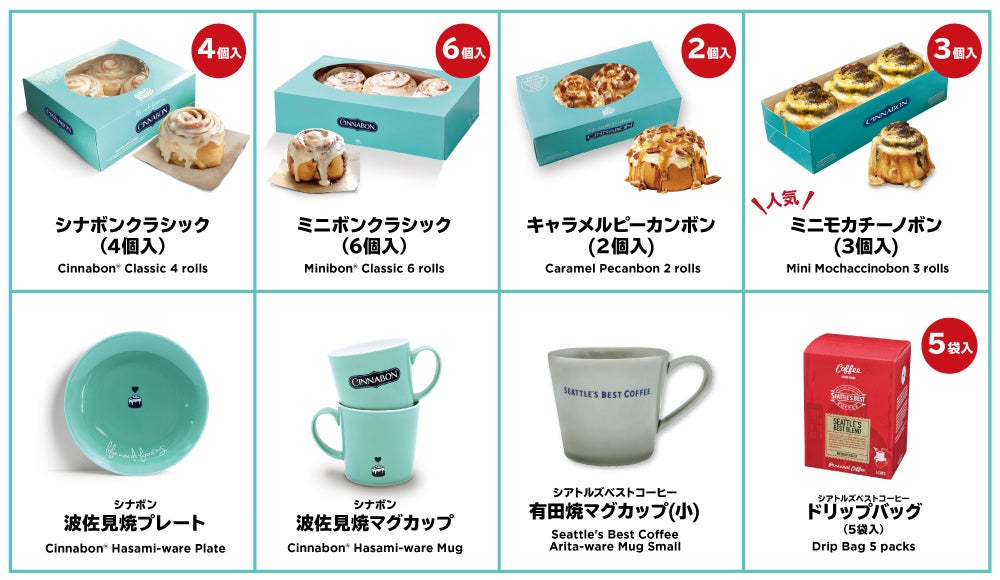 また、「シナボン」と相性が抜群の「シアトルズベストコーヒー」のドリップバッグコーヒーや、シナボングッズも豊富に取り揃えております。