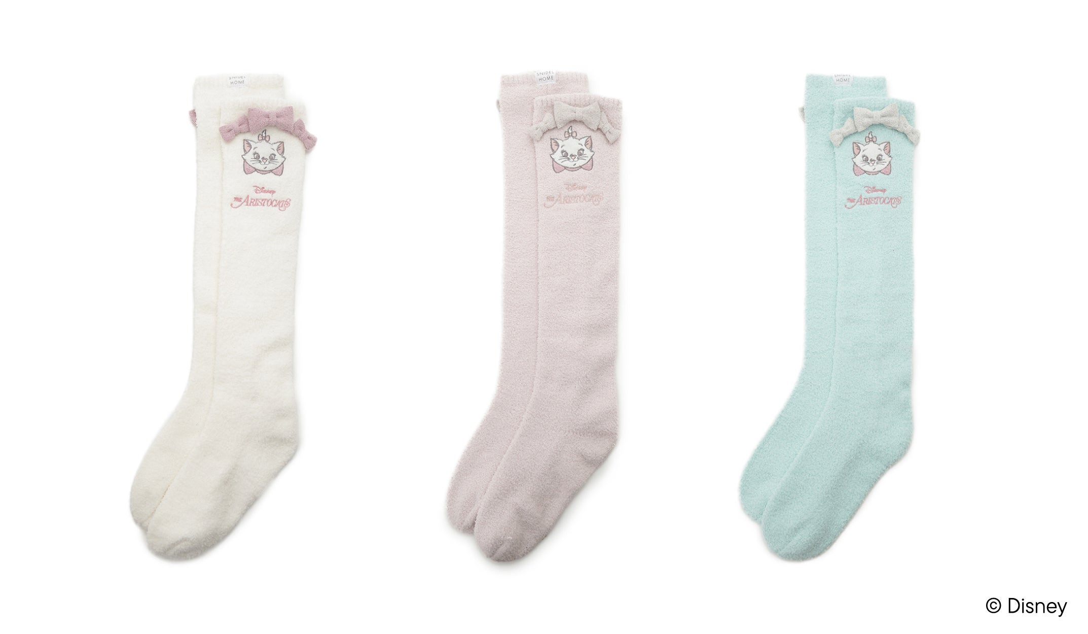 ワンポイントでマリーの顔を刺繍し、キラキラのリボンをあしらったハイソックス。足元が冷えるこれからの時期に重宝するアイテムです。履き口に付けた織りネームもさりげないポイント。
