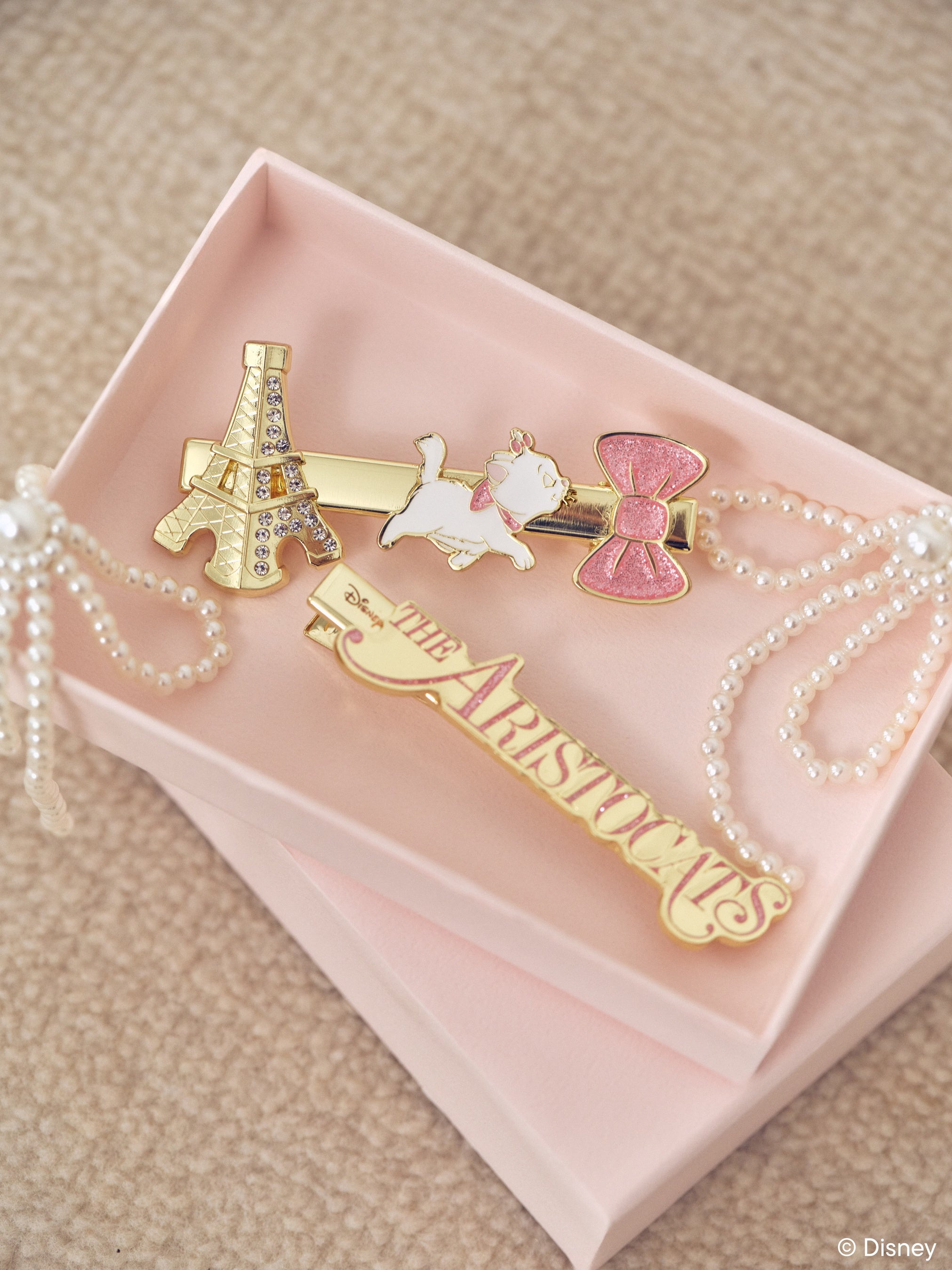 エッフェル塔やおすましして歩くマリー、リボンなどをあしらったタイプと英語のタイトル「THE ARISTOCATS」のロゴをデザインしたタイプの2本セット。