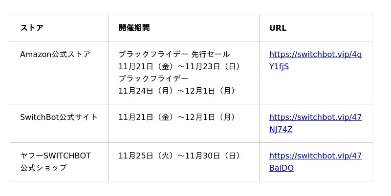 - Amazon公式ストア&SwitchBot公式サイト:11月21日(金)~12月1日(月)