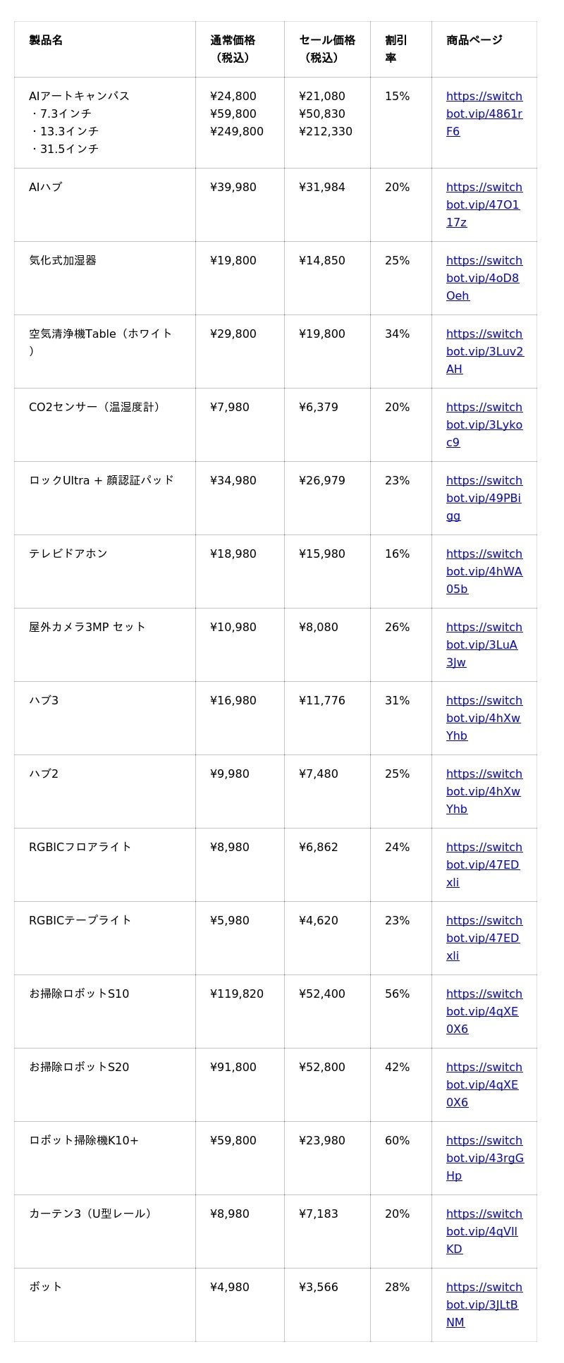 ※本価格表はAmazon公式店の情報を基にしており、SwitchBot公式サイトとは一部異なる場合があります。