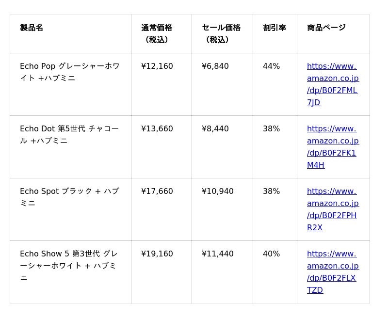 【Amazon Echo + ハブミニセット セール価格(一部抜粋)】