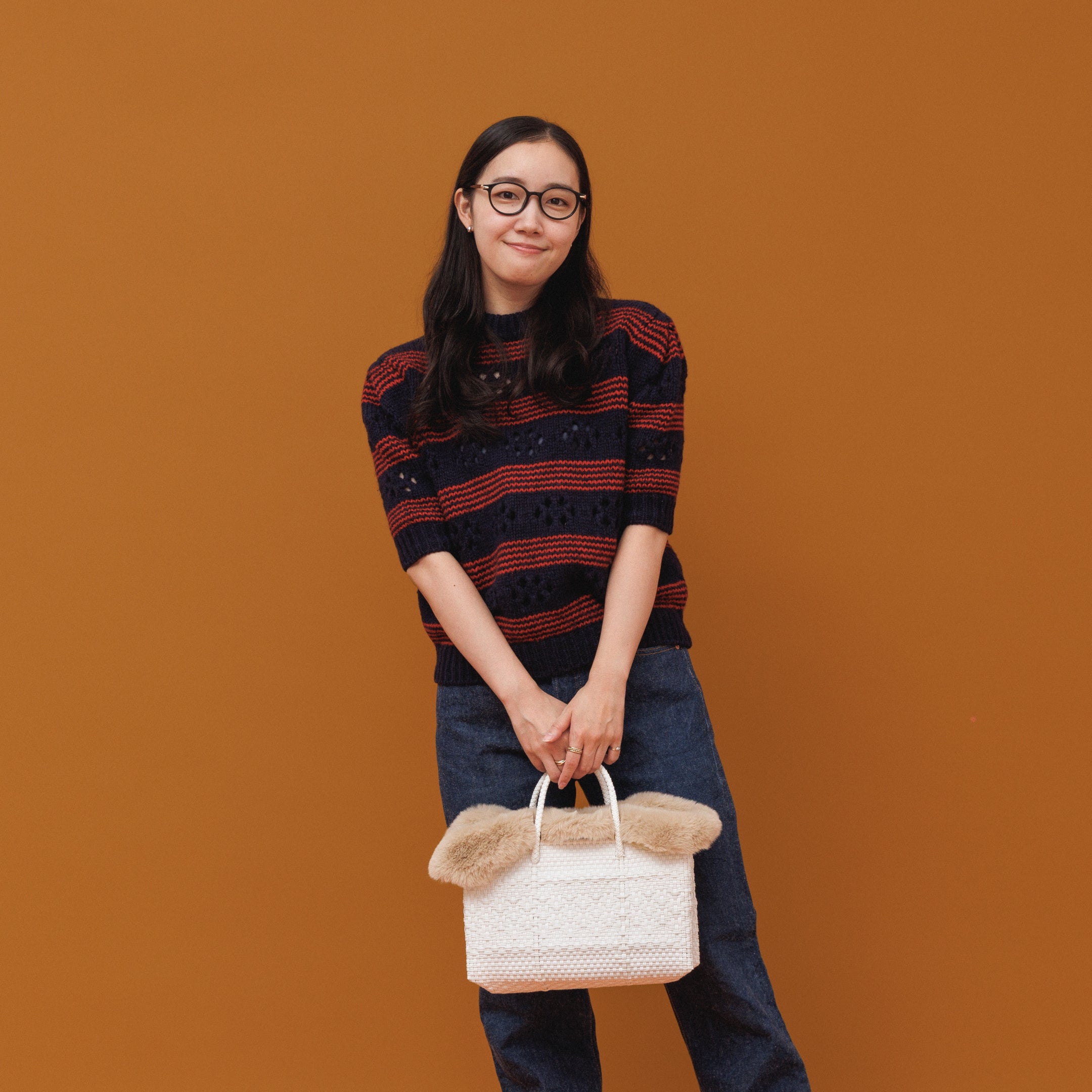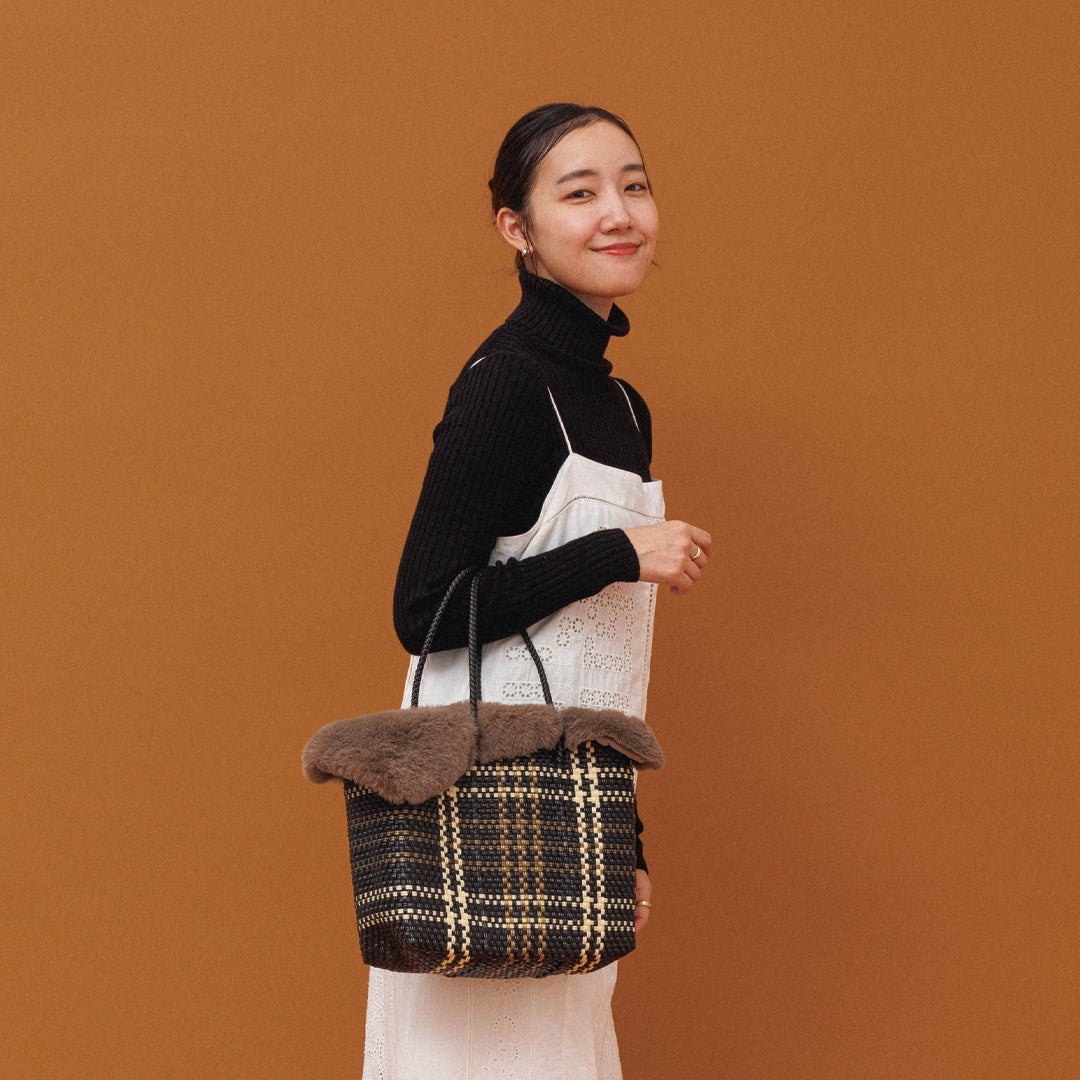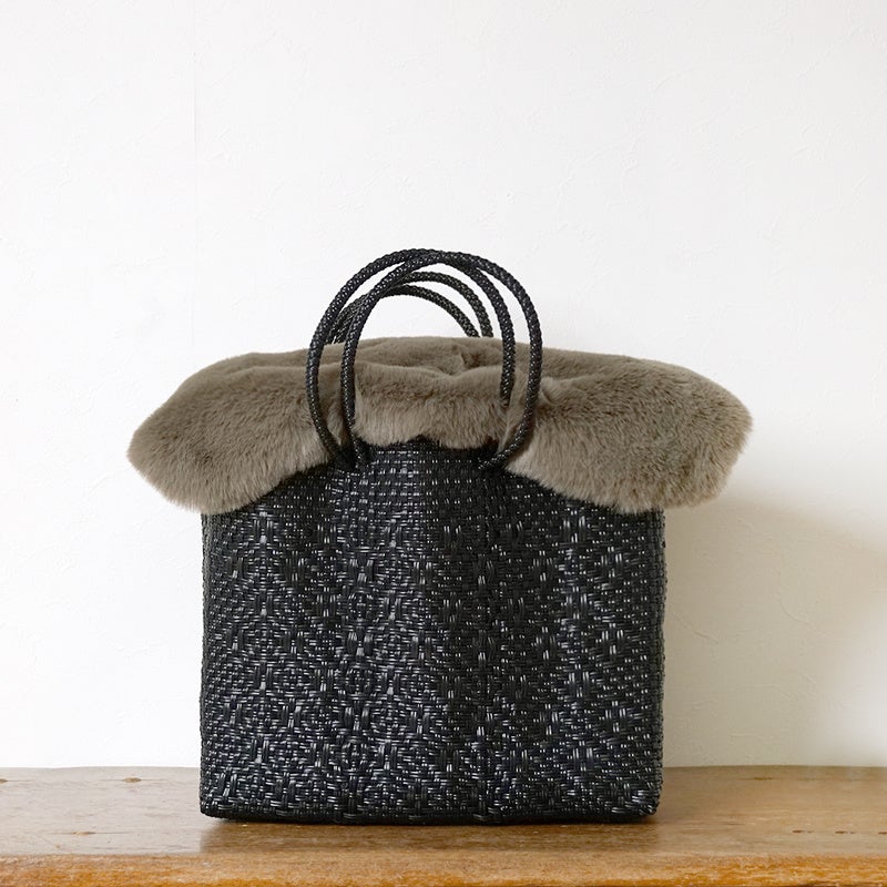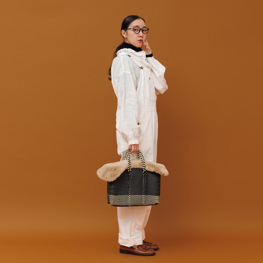 今シーズン、気になるトレンドのエコファー素材。冬のウールやダウン素材に対し、あえてかごバッグ特有の軽快な素材感と、ふわふわのエコファーを合わせることで、「異素材MIX」の絶妙なバランスを生み出します。