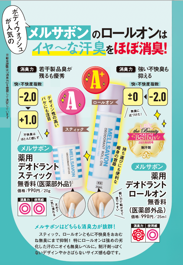 “夏のお悩み撃退Quest“と題し、デオドラント製品や暑さ対策製品をABC判定する特集(LDK the Beauty 2025年8月号)にて、『メルサボン薬用デオドラントロールオン無香料』が“制汗剤部門”で最高ランクのベストバイ及びA+評価を獲得しました。