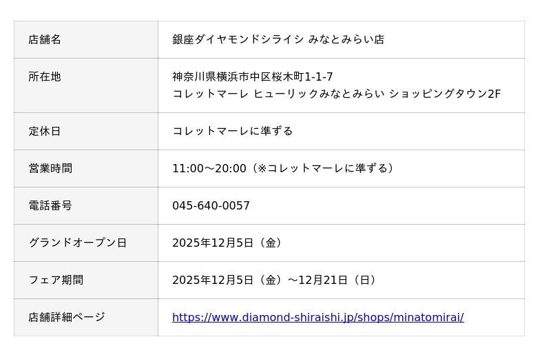 みなとみらいに新店舗。2025年12月5日(金)「銀座ダイヤモンドシライシ みなとみらい店」グランドオープン/オープニングフェアを開催