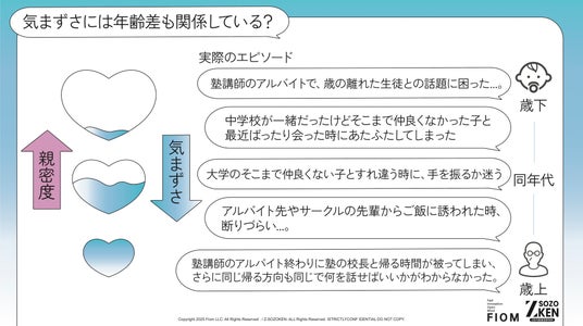 「塾講師のアルバイトで年の離れた生徒との話題に困る」「先輩からの誘いが断りづらい」など、同年代以外の垂直方向の人間関係(年齢差・上下関係)も、気まずさを増幅させる要因となっています。