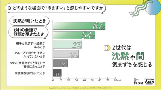 Z世代に特化したクリエイティブカンパニーFiom合同会社(本社:東京都渋谷区、代表社員:竹下洋平)が運営しているZ世代の実態や価値観を分析するシンクタンク、Z-SOZOKEN(Z世代創造性研究所)は、Z-SOZOKEN THINKTANK 最新調査研究レポートの第二弾として『Z世代の気まずいの感覚』についての調査研究レポートの第3章インサイトサマリー「気まずい感覚に秘められたZ世代ならではの距離感や関係構築とは?」をリリースしました。